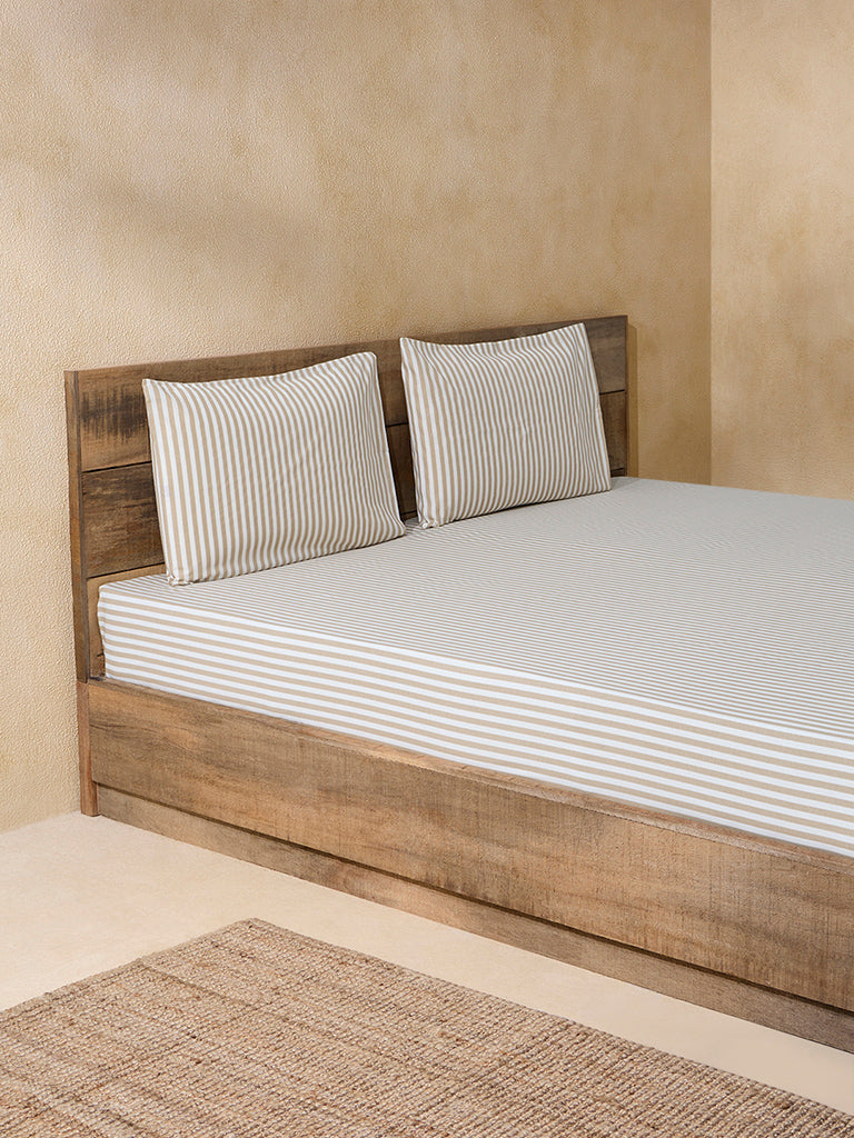 Westside Home Beige Stripe Printed King Bed Flat Sheet and Pillowcase Set