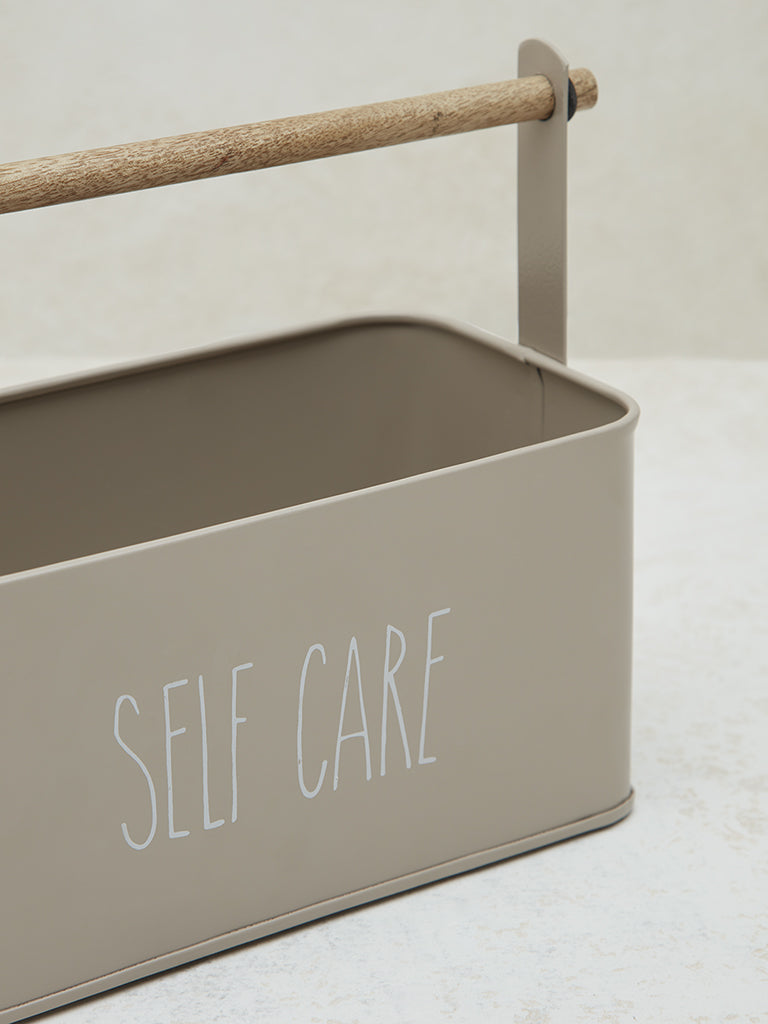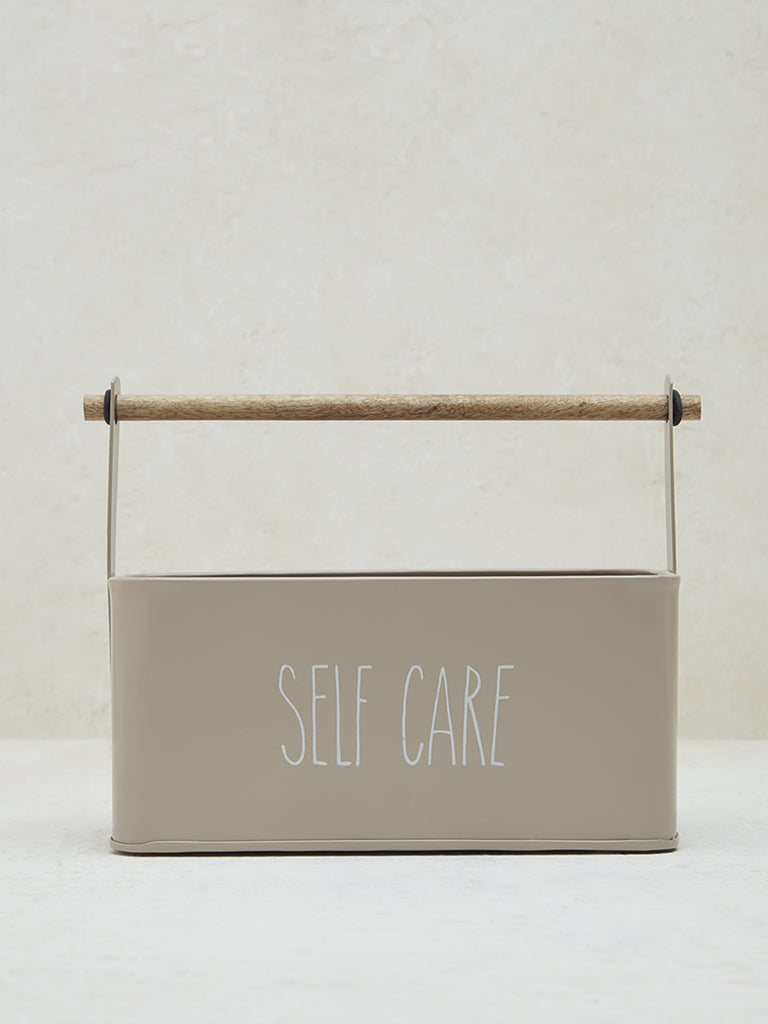 Westside Home presents this self-care caddy in a soothing beige color. designed to organize your essential items with style. Featuring a spacious interior. this versatile caddy is perfect for holding bath products. skincare essentials. or personal belongings. The sturdy metal construction and wooden handle ensure easy transport. making it ideal for the bathroom. bedroom. or on the go. The Self-Care inscription adds a touch of inspiration. serving as a daily reminder to prioritize your well-being.