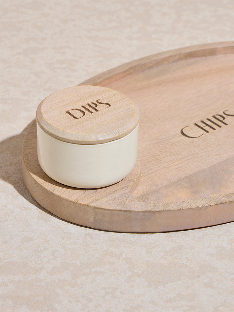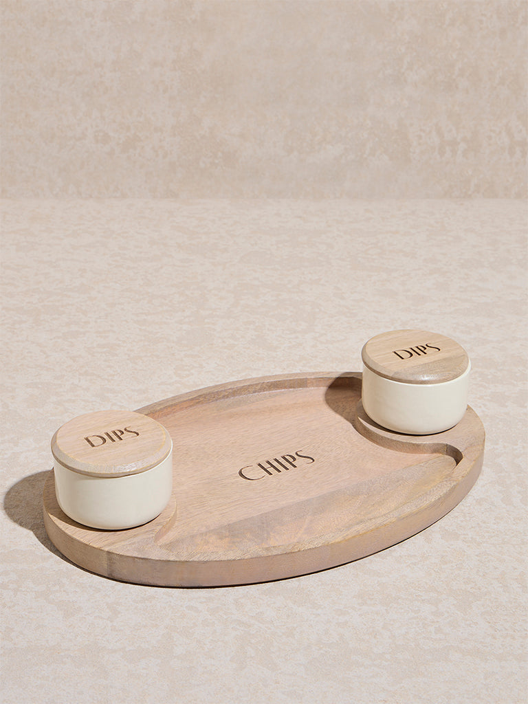 Make entertaining effortless with this chip and dip from Westside Home. Featuring two beautifully crafted bowls atop a solid wooden base. this set is perfect for serving your favorite chips and dips. The chic text design on the ceramic adds a contemporary flair. while the natural wood base provides a warm. rustic contrast. Ideal for casual gatherings or stylish parties. this chip and dip set combines modern design with practical function. making it a standout piece on any table.