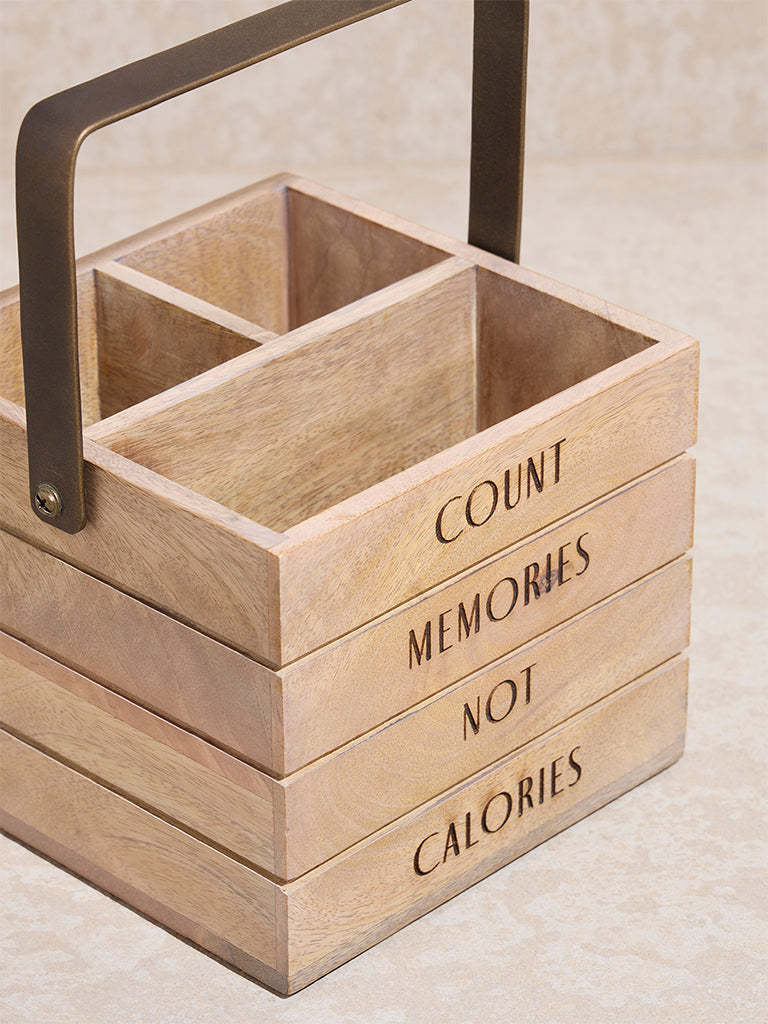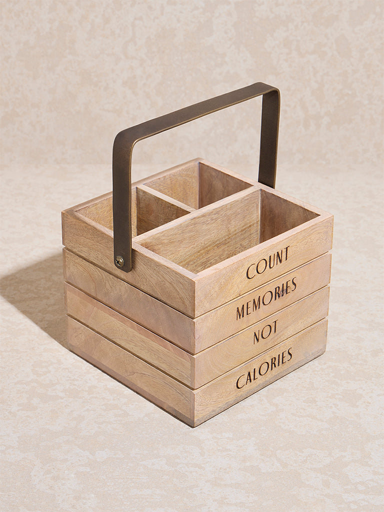 Bring organization and a touch of personality to your kitchen with this beige cutlery caddy from Westside Home. With three spacious compartments to neatly store knives. spoons. and forks. this caddy offers the perfect balance of style and practicality. The metal handles provide ease of transport. while the text design adds a personal flair to your kitchen decor. Crafted from durable wood. it ensures long-lasting use while adding a rustic. modern aesthetic to your countertop or dining table. This caddy is the ideal solution for keeping your utensils within reach in an effortlessly chic way.