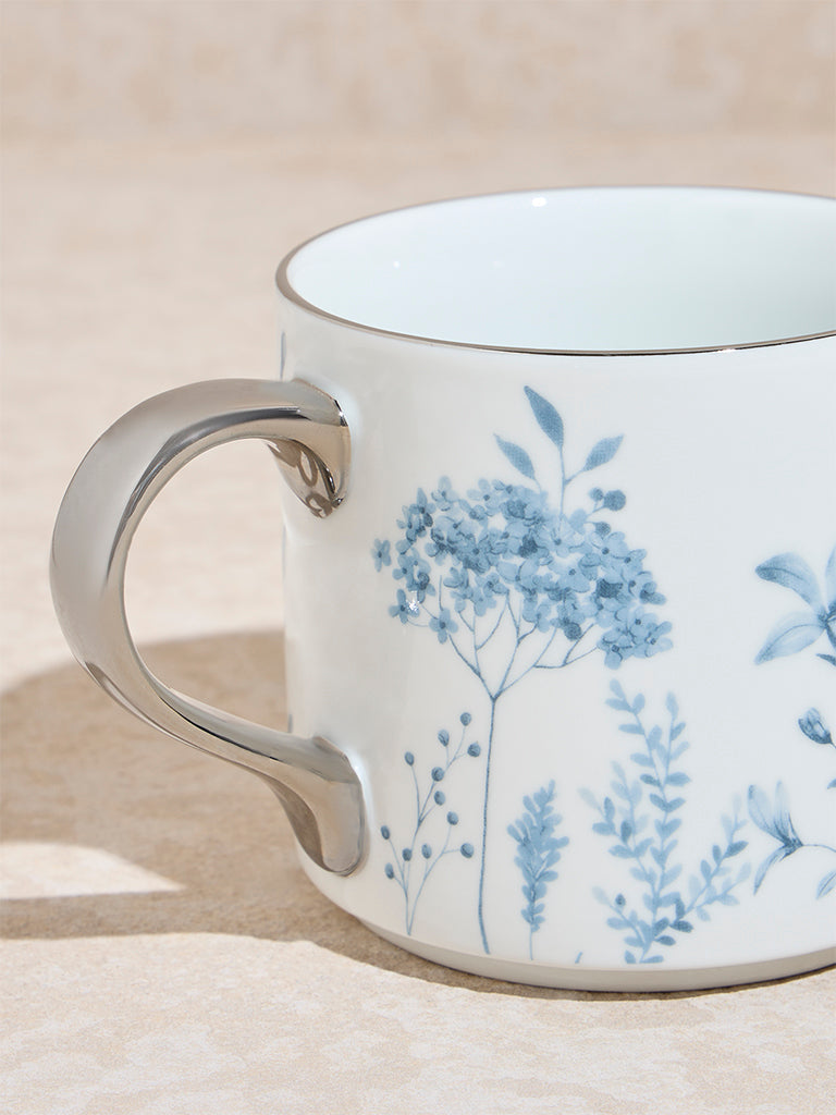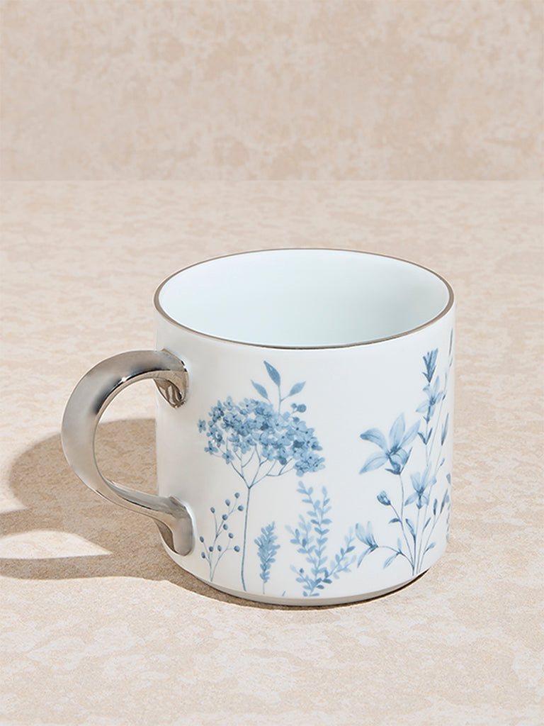 Add elegance to your drinkware collection with this beautiful blue mug by Westside Home. Crafted from premium porcelain. it features a refined straight shape adorned with exquisite blue botanical prints that exude charm. The sleek silver handle adds a modern touch. ensuring both style and functionality. Dishwasher safe for effortless cleaning. this mug is perfect for enjoying your favourite hot beverages in sophisticated style. whether for everyday use or special occasions.