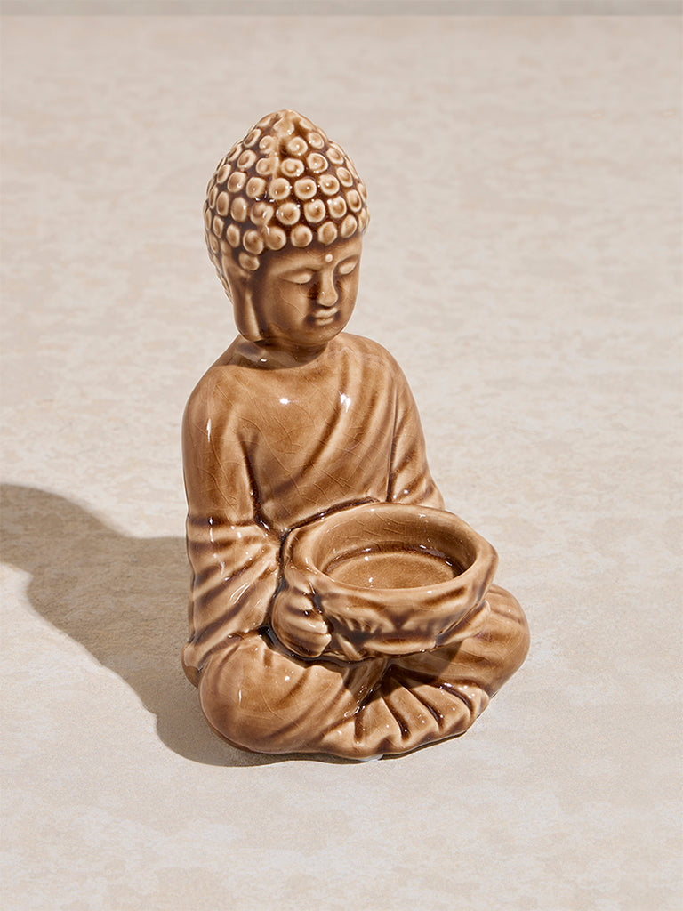 Channel tranquility and inner peace with this brown buddha candle holder from Westside Home. Sculpted in warm brown tones. this serene Buddha figure exudes calm. while the integrated tealight holder brings a soft. ambient glow to your space. Whether placed in your living room. meditation corner. or bedroom. it adds a sense of serenity and balance. Perfect for those seeking both a spiritual touch and a peaceful. glowing atmosphere. this piece seamlessly merges art and mindfulness in one beautiful form.