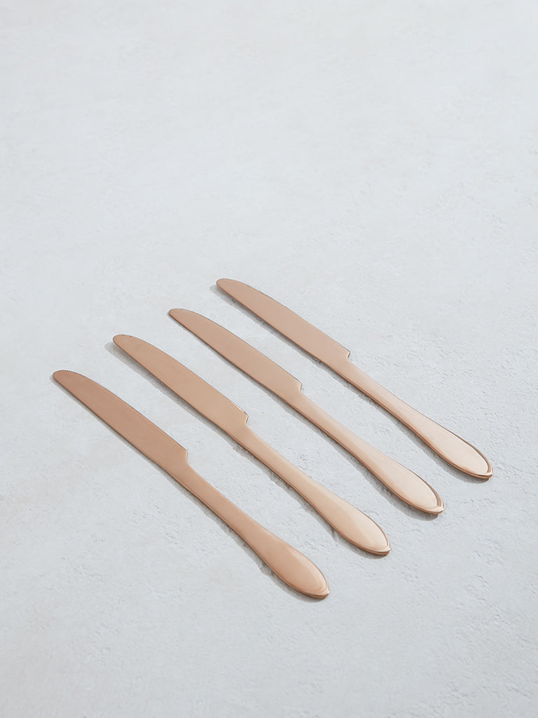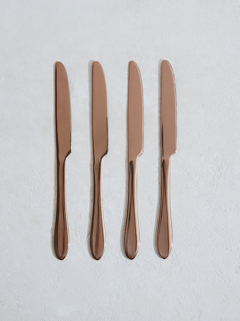 With its sleek brown copper design. this set of four knives from Westside Home redefines your meal preparation as an artistic endeavour. Elevate your kitchen arsenal with this chic and functional set. adding a touch of refined style to your cooking routine.