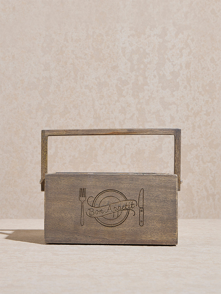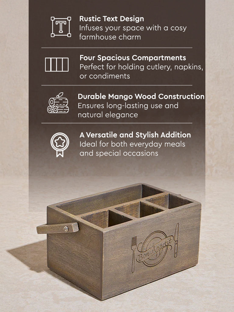 Organize your dining essentials with flair using this cutlery caddy from Westside Home. Featuring four spacious compartments. this caddy effortlessly holds cutlery. napkins. or condiments. keeping your dining space neat and tidy. The rustic brown finish. paired with charming text design. adds a warm. farmhouse touch to your table setting. Whether for daily use or entertaining guests. this caddy blends functionality with style. making it a practical and visually appealing addition to your kitchen or dining room.