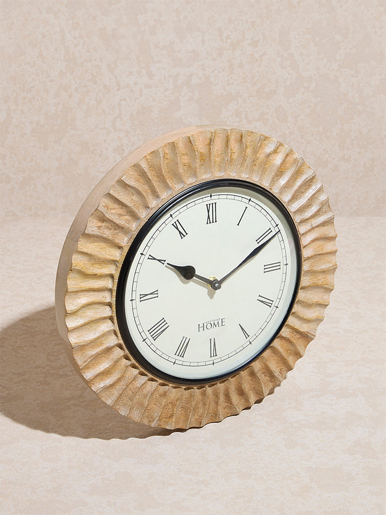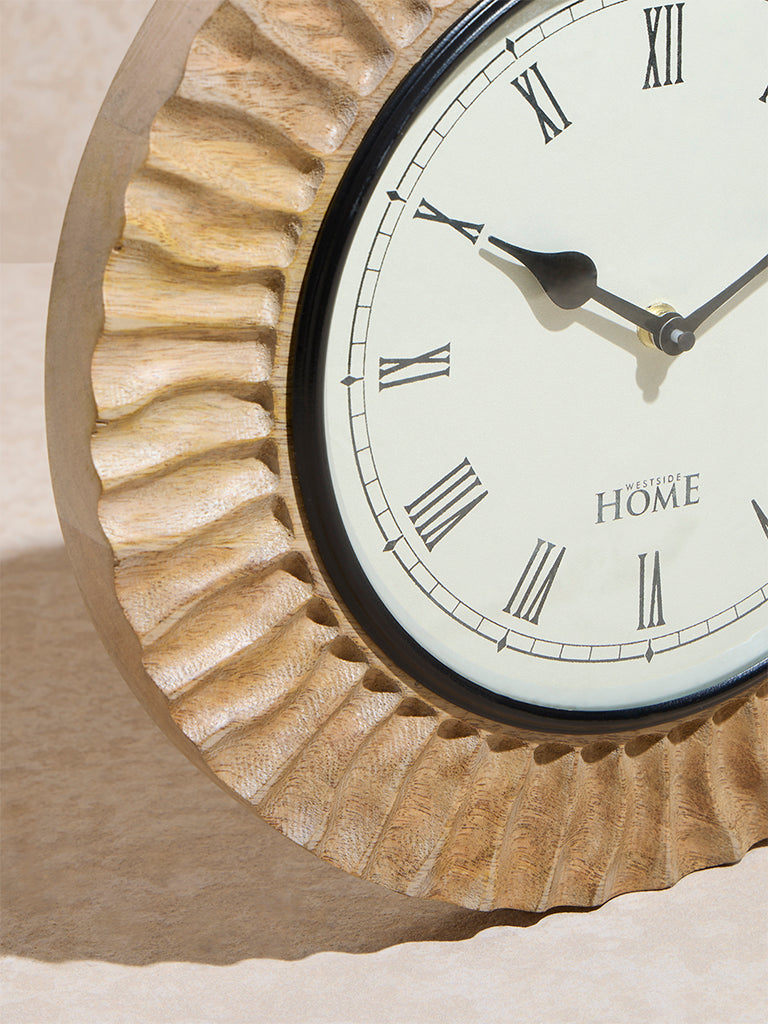 Infuse your living space with the natural warmth of this wooden wall clock from Westside Home. This exquisite piece showcases a rich brown finish with a textured surface that adds depth and character to its design. The clock’s minimalist numerals and sleek hands keep the focus on the beautiful wood grain. making it an understated yet elegant addition to any room. Its timeless appeal makes it a versatile choice for both modern and traditional decor. effortlessly blending form and function while serving as a sophisticated timekeeping centrepiece.