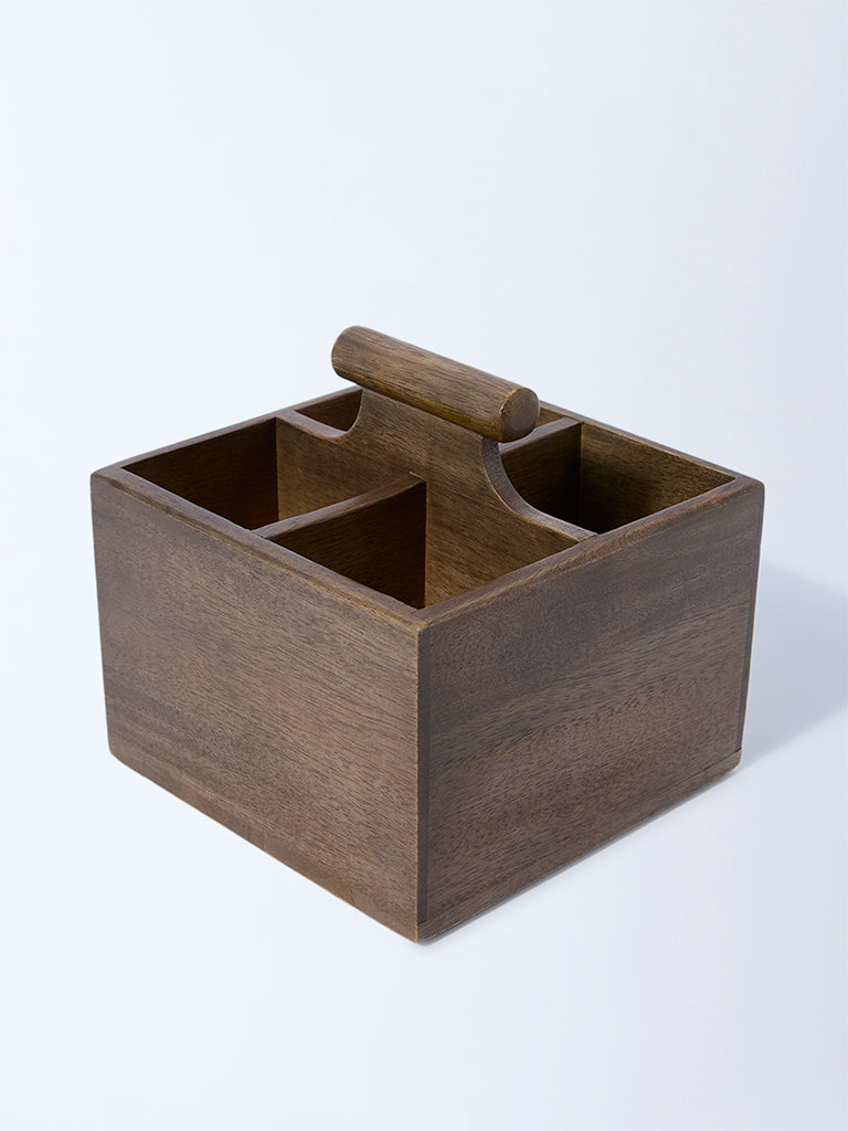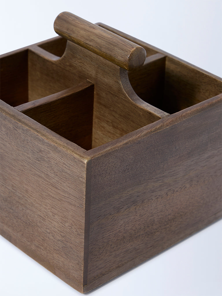 Keep your table or countertop effortlessly organised with this brown wooden caddy from Westside Home. Featuring four sections. it’s designed to neatly hold cutlery. condiments. or small essentials in one place. The warm wooden finish adds natural charm. making it equally at home in a rustic kitchen or a contemporary dining setup. From family dinners to outdoor picnics. it brings both order and style to your serving routine.