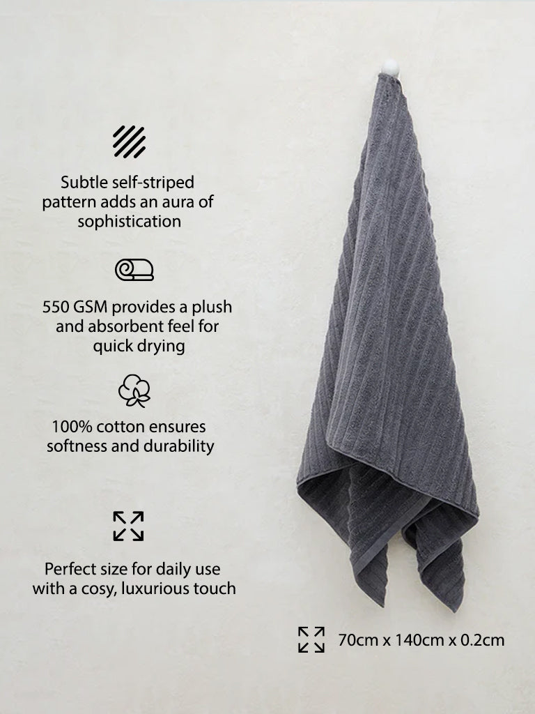 Westside Home presents this charcoal self-striped bath towel. a perfect blend of style and functionality. This towel features a rich dark blue hue with a subtle self-striped design. adding a touch of sophistication to your bathroom decor. Made from soft and highly absorbent fabric. it provides a cozy and quick-drying experience after each use. Ideal for daily indulgence. this bath towel brings both elegance and practicality to your bath time essentials.