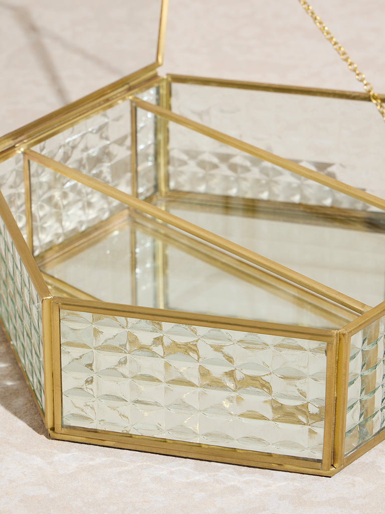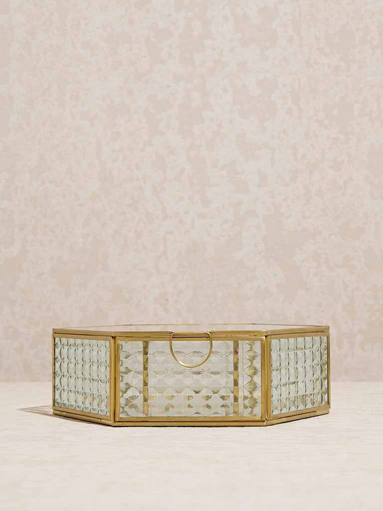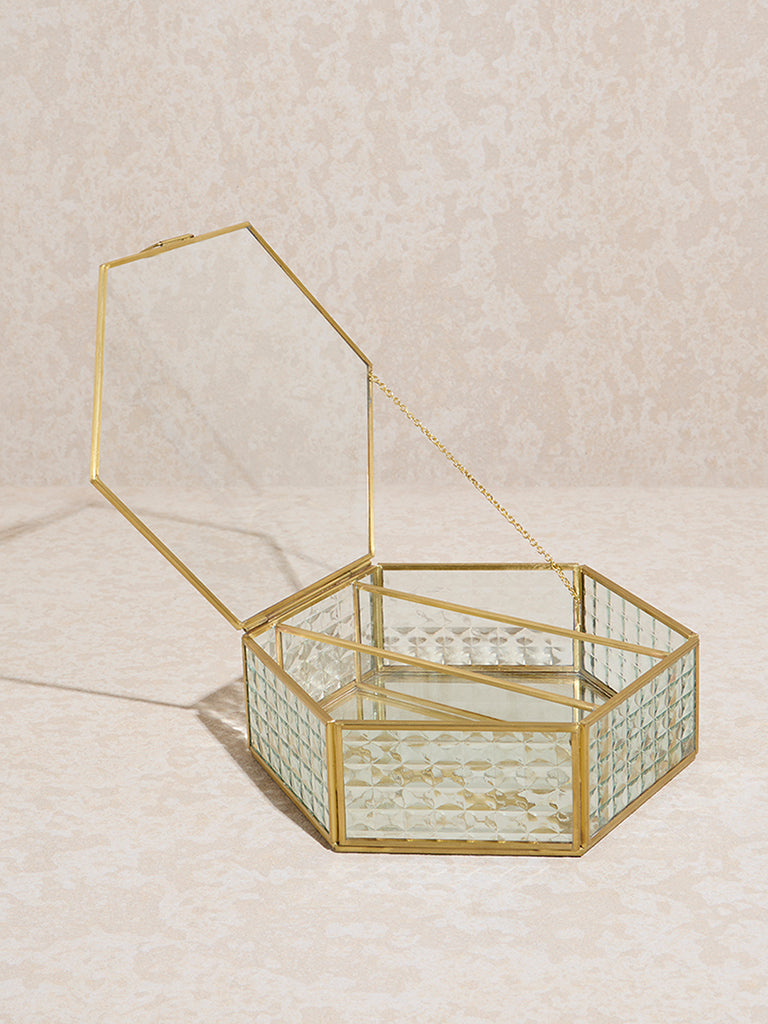 Safeguard your treasured jewels with this glass jewellery box from Westside Home. a striking blend of luxury and functionality. This elegant box is crafted from pristine clear glass. allowing your jewelry to shine from within. while the gold-toned border adds a touch of regal sophistication. The fitted lid ensures your precious pieces stay securely stored. whether displayed on a vanity or tucked away on a shelf. With its timeless design. this jewellery box isn’t just a storage solution??it’s an exquisite decor piece that transforms your space into a sanctuary of style.