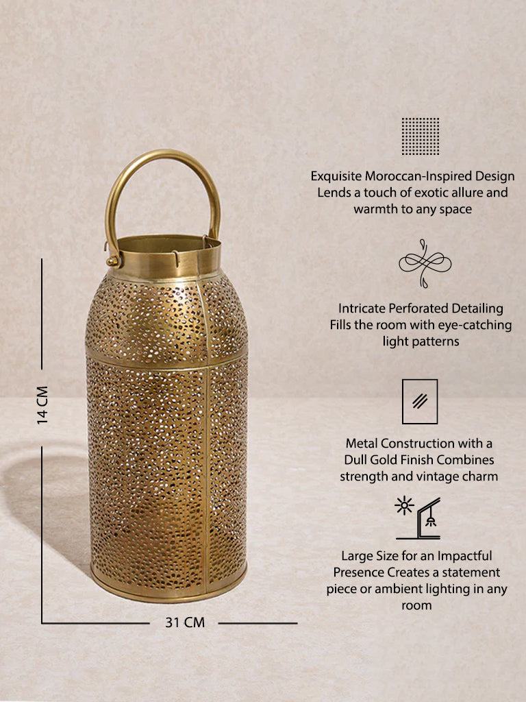 Revamp any space with this lantern from Westside Home. an exquisite piece that brings exotic charm and warmth to your home. The larger size allows the mesmerizing light patterns to fill your room with an enchanting glow. while the dull gold finish offers a rustic. vintage feel. Ideal for use as ambient lighting or as a statement piece in a cozy corner. this lantern elevates your decor with its intricate design and luxurious presence. making every moment in its glow feel like an intimate escape.