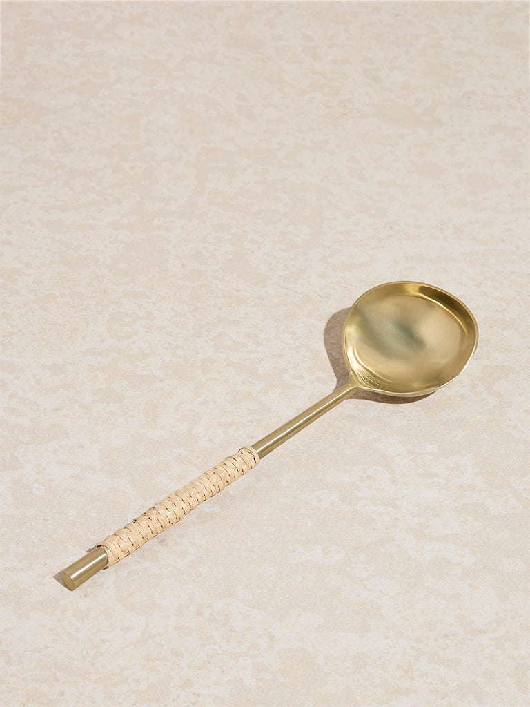 Elevate your table setting with this large serving spoon from Westside Home. Drenched in a luxe dull gold tone. it brings understated elegance to every meal. But it’s the rattan-wrapped handle that steals the show??blending rustic charm with contemporary finesse. Ideal for dishing out hearty servings at dinner parties or family feasts. this spoon isn’t just functional; it’s a conversation starter. Whether you’re serving up biryani or pasta. this piece adds a warm. earthy contrast to polished dinnerware.