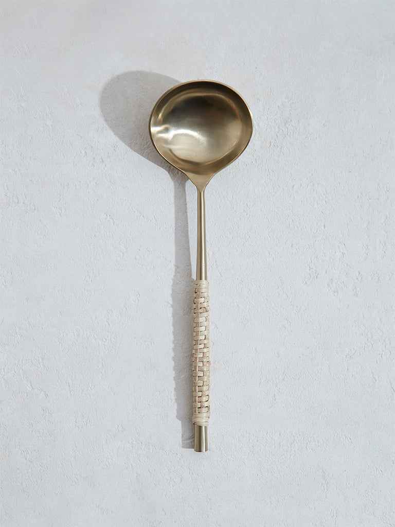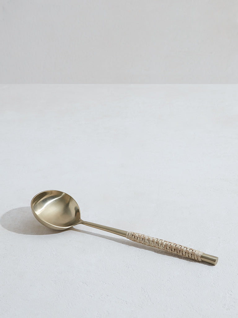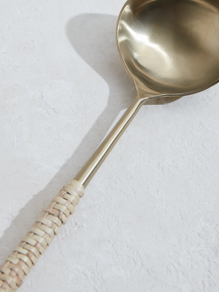 Let each scoop becomes a statement of both culinary finesse and design sophistication with this dull gold serving spoon from Westside Home. The incorporation of rattan detailing on the handle introduces a touch of nature.