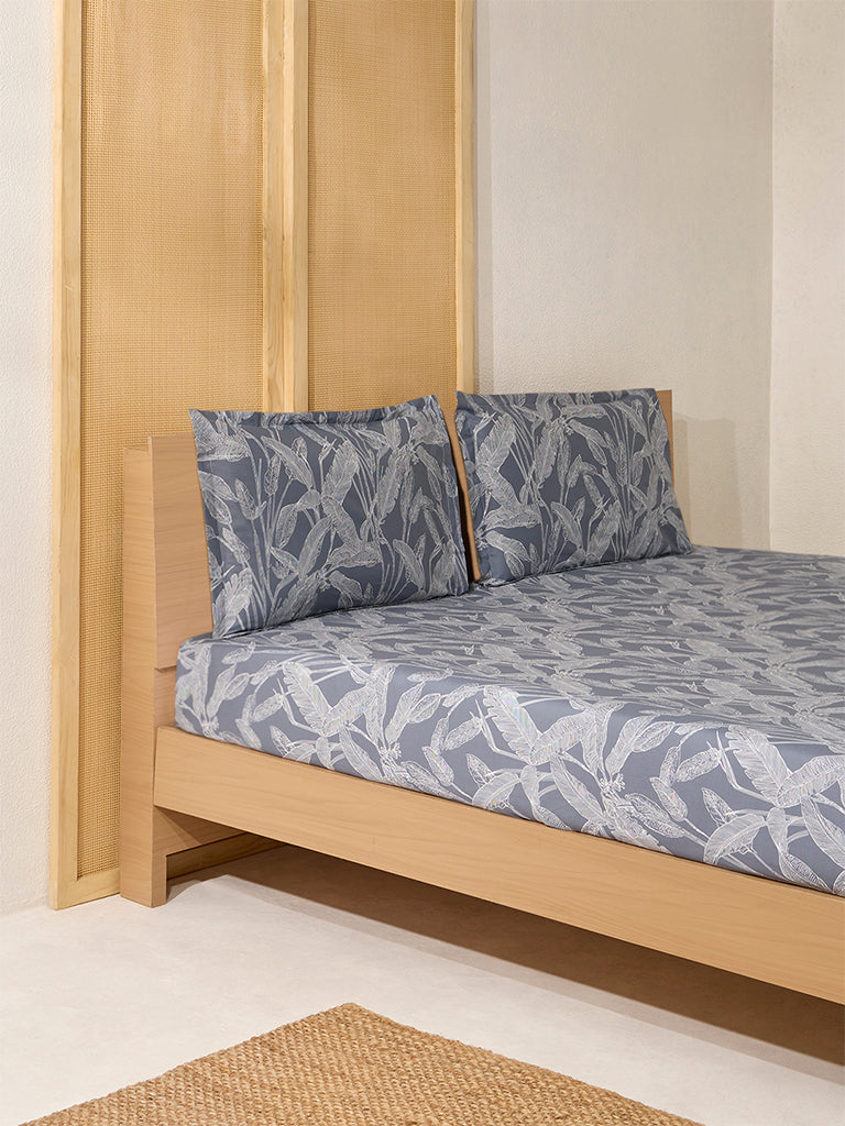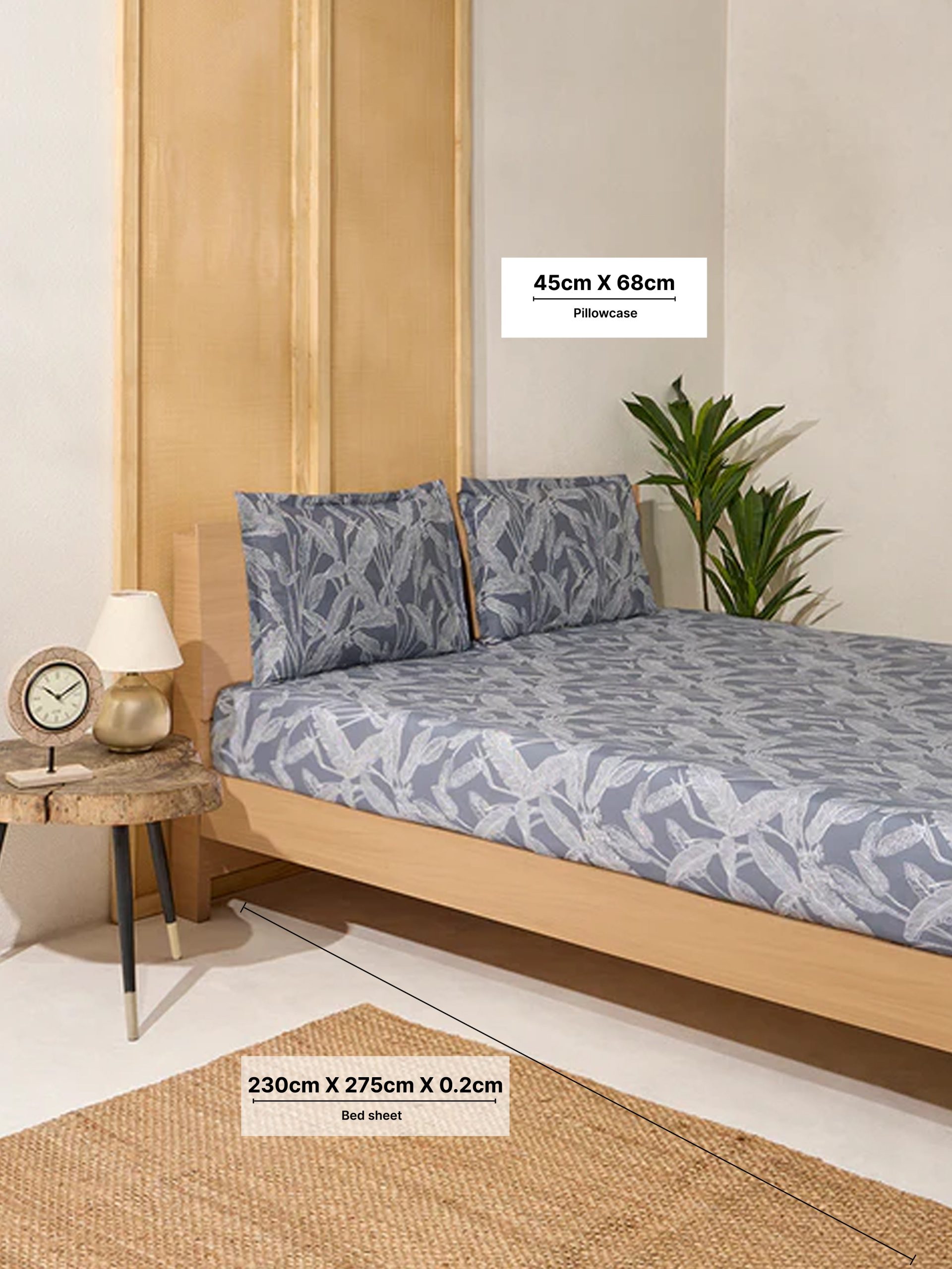 Westside Home Dusty Blue Leaf Printed Queen Bed Flat Sheet and Pillowcase Set