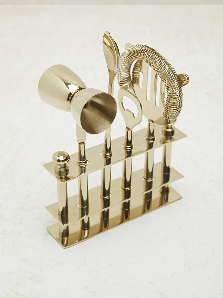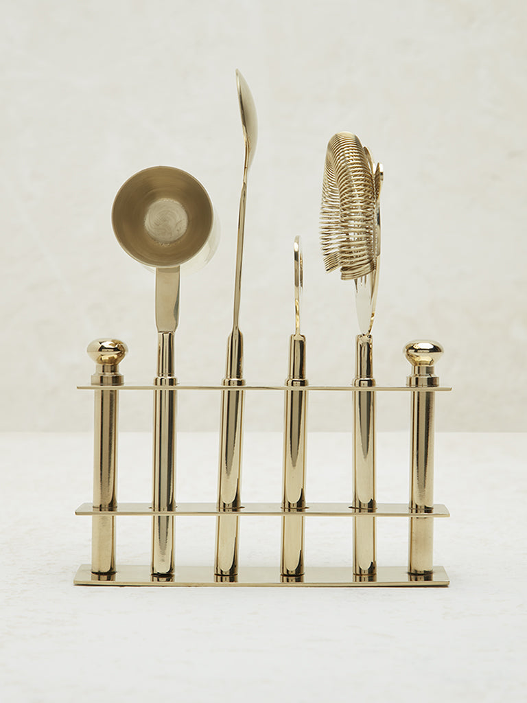 Westside Home presents this gold-tone bar tool set. designed to elevate your home bar experience. This stylish set includes all the essentials for crafting your favorite cocktails: a jigger. mixing spoon. cocktail shaker. strainer. and muddler. The sleek gold-tone finish adds a touch of sophistication to any kitchen or home bar. Neatly organized in a matching stand. these tools are both functional and elegant. offering easy storage and access.