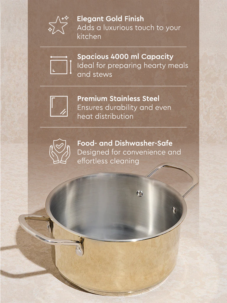 Cook in style with this casserole from Westside Home. a sleek and versatile addition to your kitchen. Designed with a striking golden finish. this casserole is as visually appealing as it is functional. Its sturdy build ensures even heat distribution. making it perfect for slow-cooking. stews. and casseroles. The elegant gold-tone exterior complements any modern kitchen. while the spacious interior offers ample room for your favourite dishes. Bring a touch of luxury to your cooking with this essential kitchen companion that effortlessly marries beauty and utility.