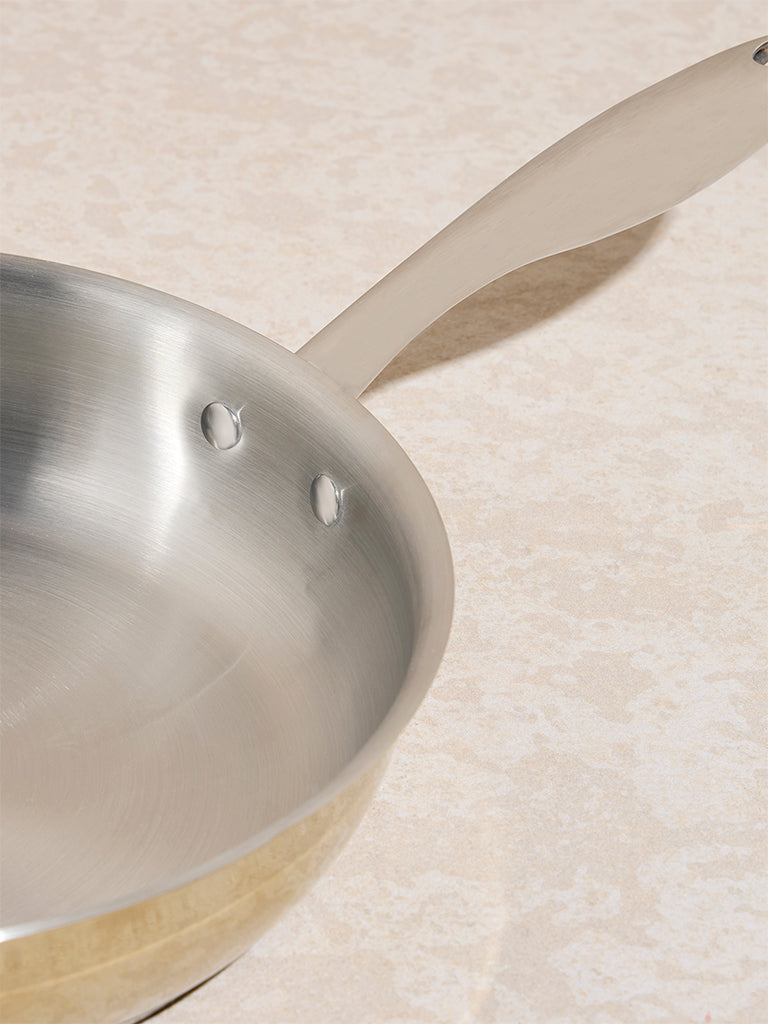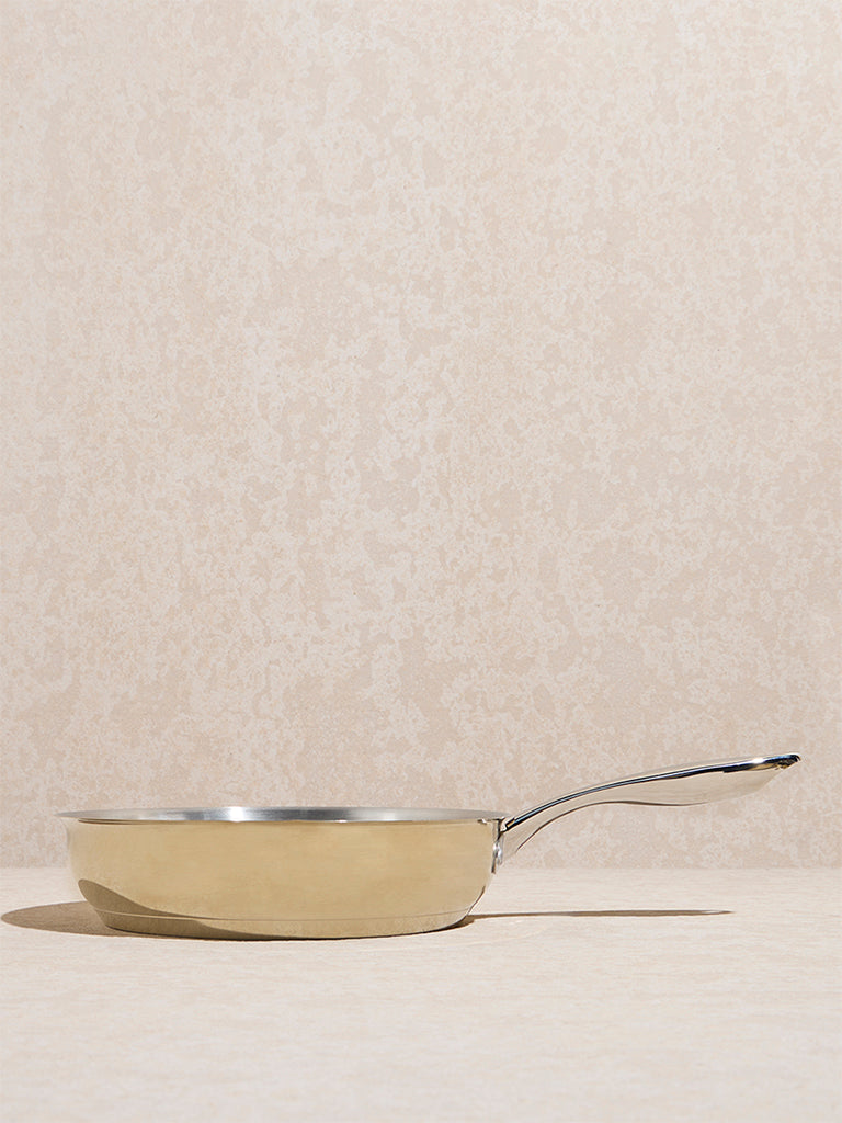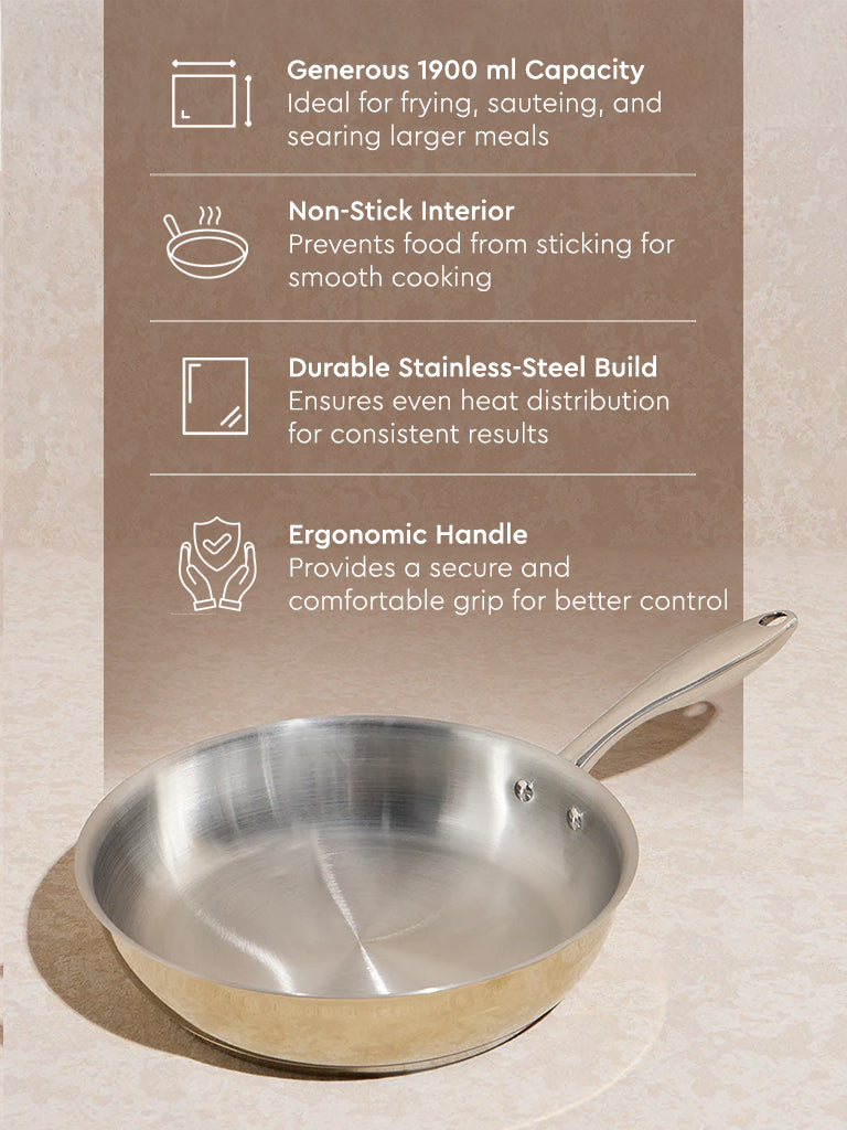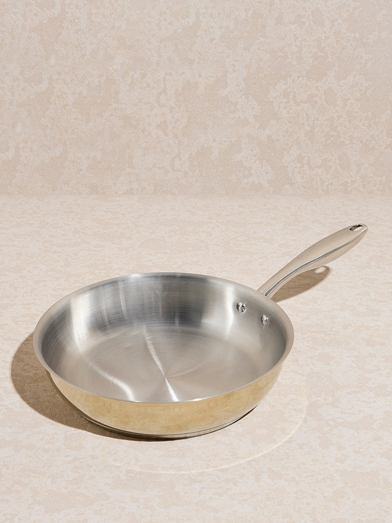 Sear. saute. and simmer with this frying pan from Westside Home. a must-have in your culinary arsenal. With its eye-catching gold finish and non-stick surface. this pan ensures effortless cooking and easy cleanup every time. Its generously sized surface is perfect for cooking larger meals. while the robust handle provides a comfortable grip. Whether you’re preparing a quick stir-fry or a hearty breakfast. this frying pan brings a touch of sophistication to your kitchen while delivering excellent heat retention for perfect results.