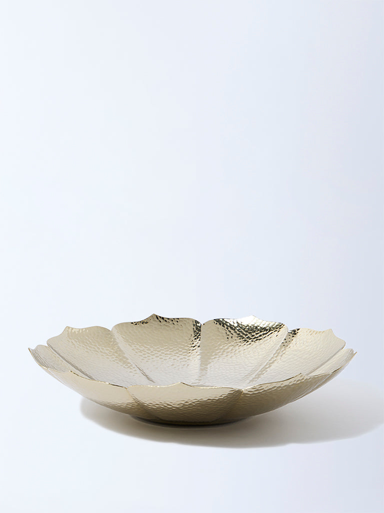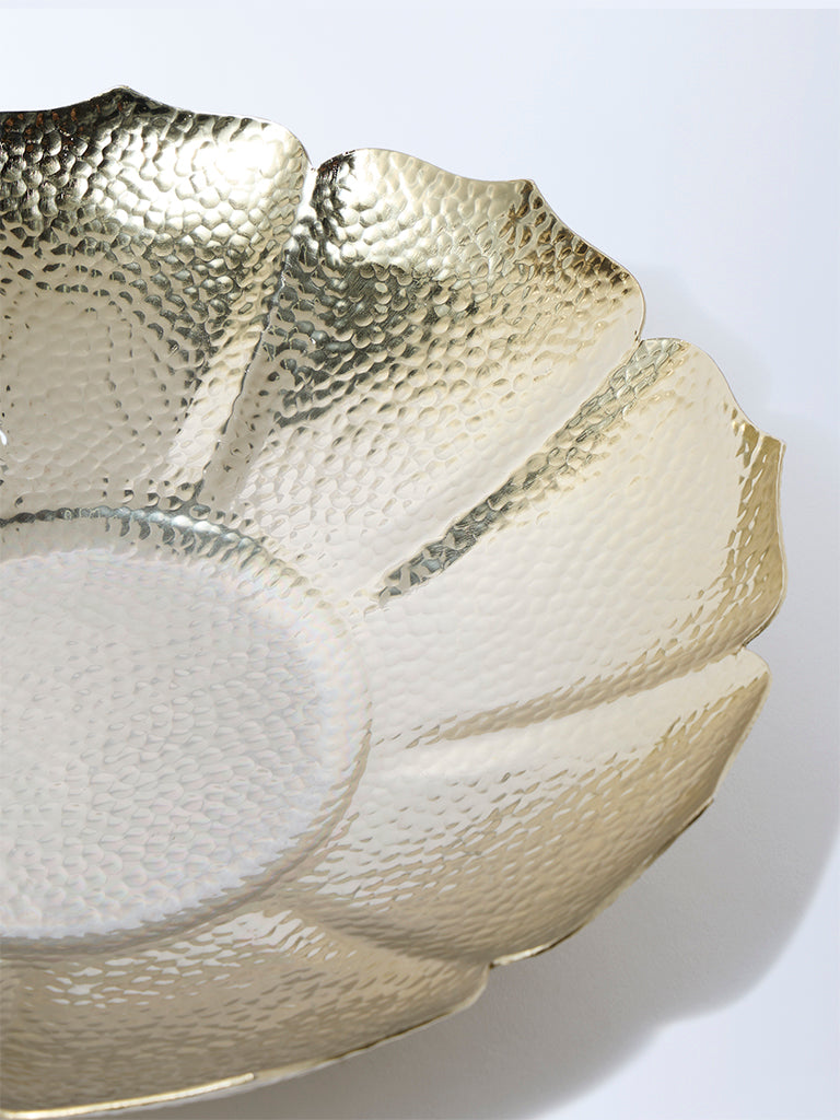 Compact yet captivating. this gold lotus hammered platter from Westside Home brings instant radiance to any surface. Its lotus-inspired silhouette and hammered finish create a decorative focal point. ideal for accenting side tables. consoles. or shelves. A versatile d??cor piece. it pairs beautifully with candles. trinkets. or layered d??cor arrangements. adding subtle luxury to everyday spaces.