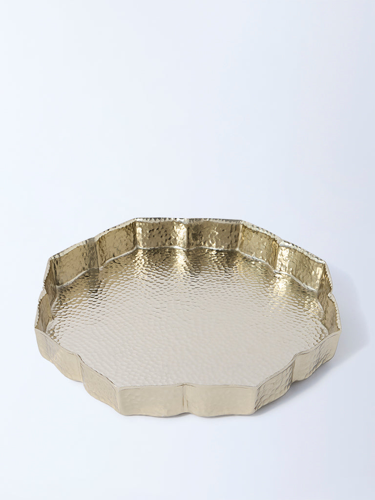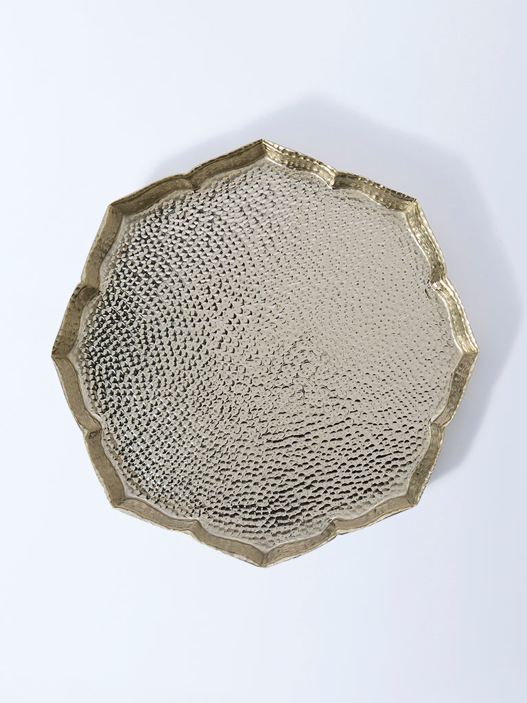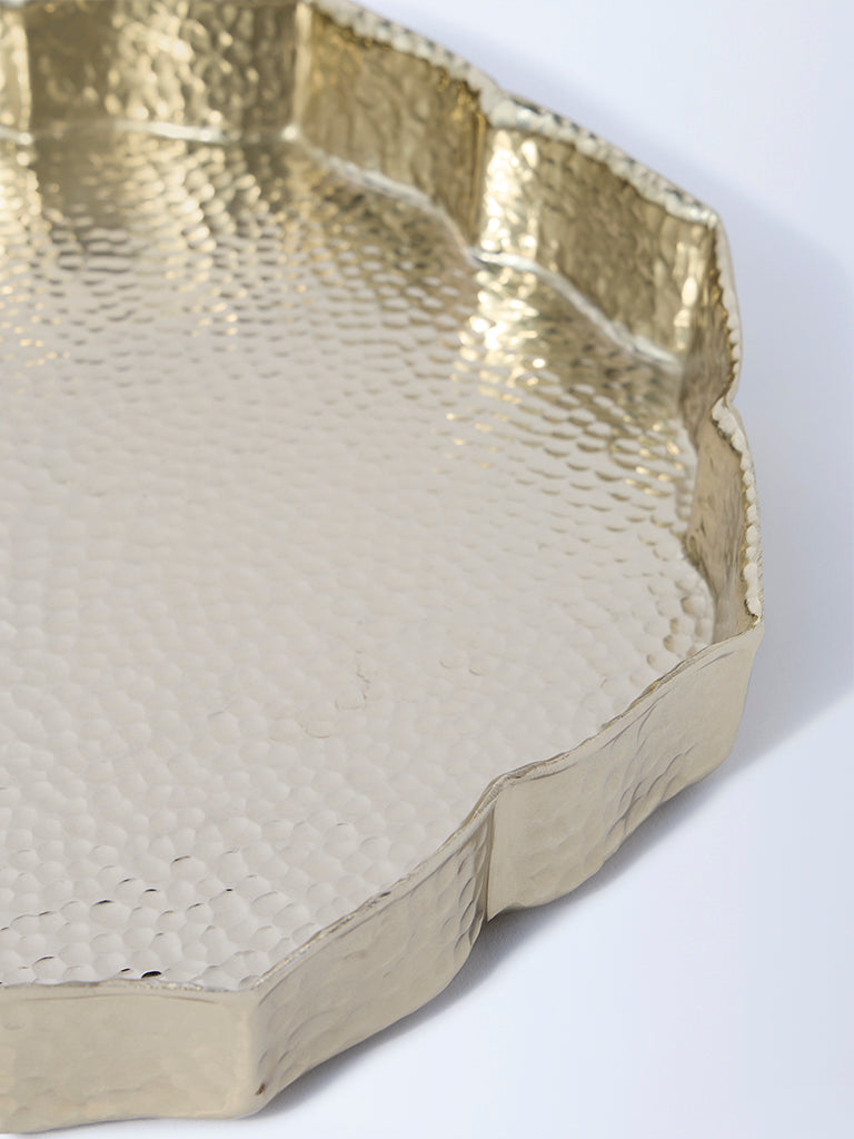 Celebrate hosting with this gold lotus hammered serving tray by Westside Home. a piece that blends artistry with practicality. The hammered texture catches the light beautifully. while the lotus-inspired design gives it a distinctive. decorative flair. Perfect for presenting drinks. snacks. or festive spreads. it serves as both a functional accessory and a statement accent.