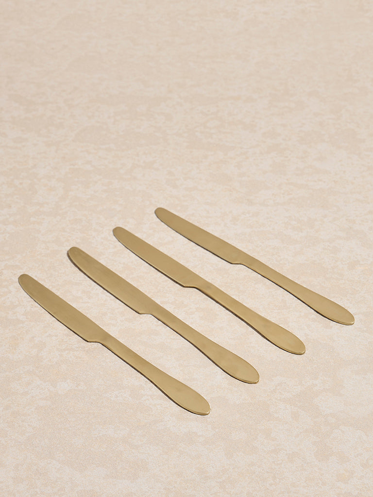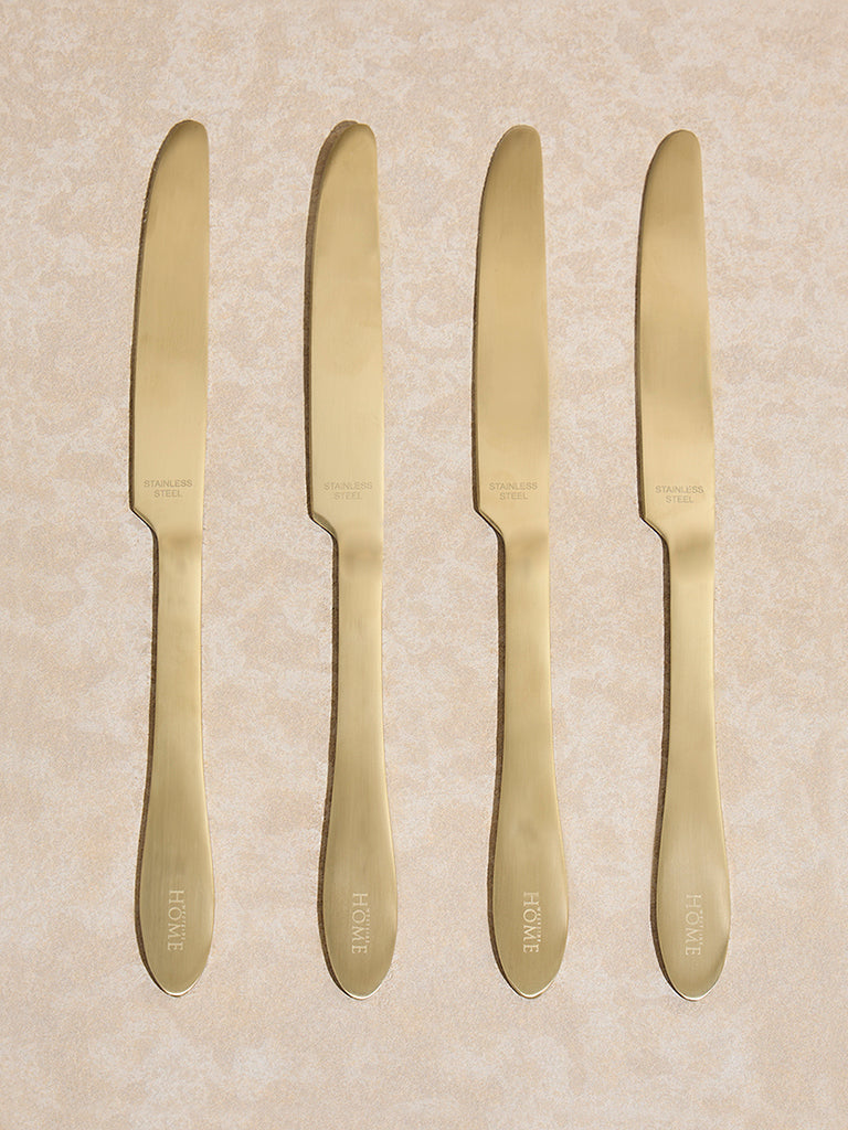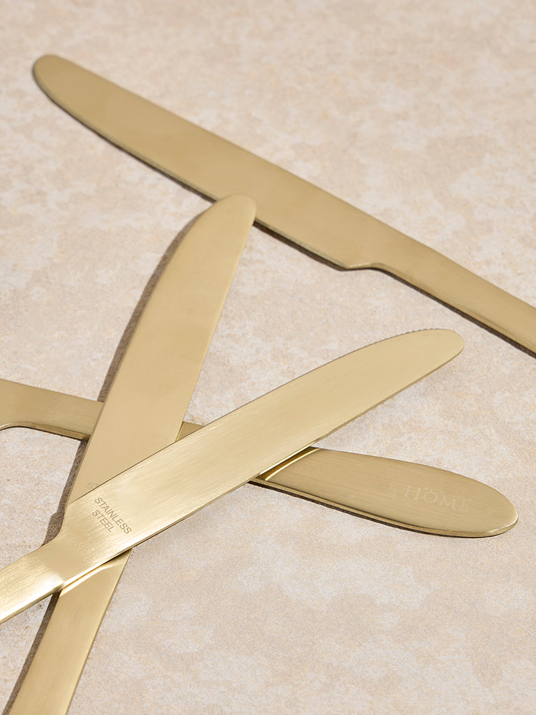 Crafted for those who appreciate subtle luxury. this set of four gold matte table knife set from Westside Home lends a polished finish to your table setting. The matte texture feels modern and composed. while the balanced weight offers comfort in every slice. Ideal for both casual dinners and curated hosting. these knives bring a sense of deliberate style to the dining experience??graceful. functional. and always poised.