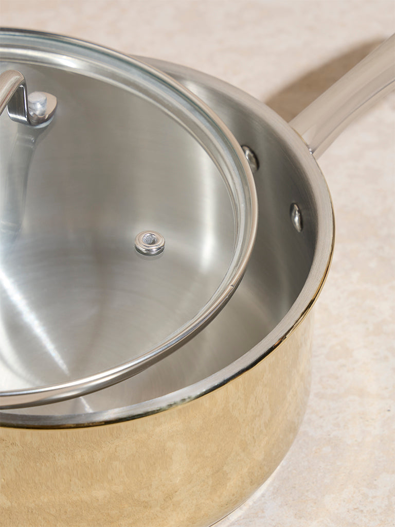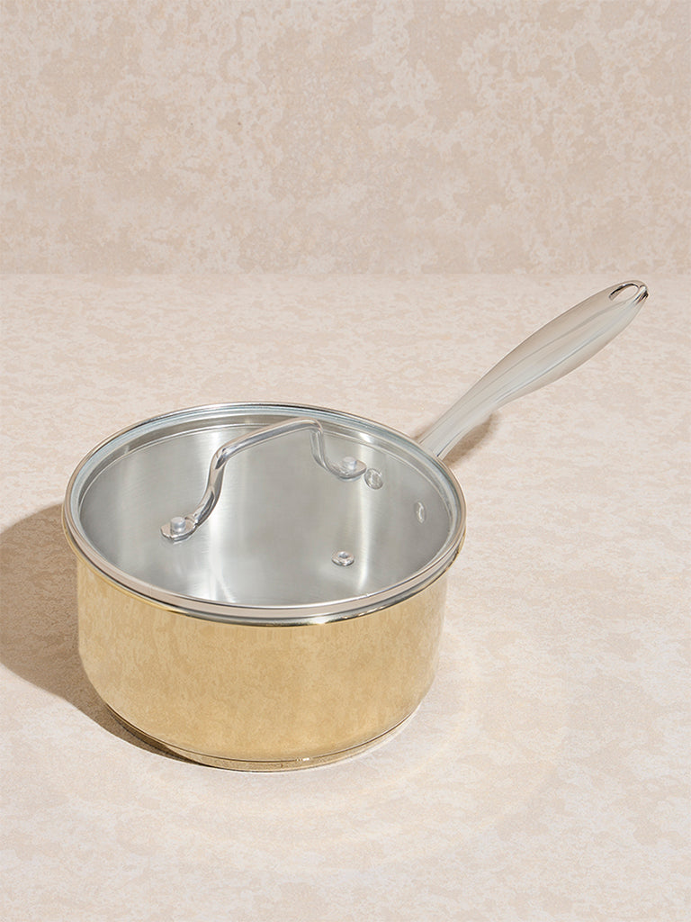 Brew your favourite beverages or heat milk in this milk pan from Westside Home. combining style with practicality. Featuring a beautiful gold-tone exterior. this milk pan boasts a durable construction and a heat-resistant glass lid for easy monitoring while cooking. The small size is perfect for boiling milk. preparing sauces. or reheating soups. With its sturdy handle for safe pouring. this pan offers precision and elegance. making it a functional and chic addition to your kitchen essentials.