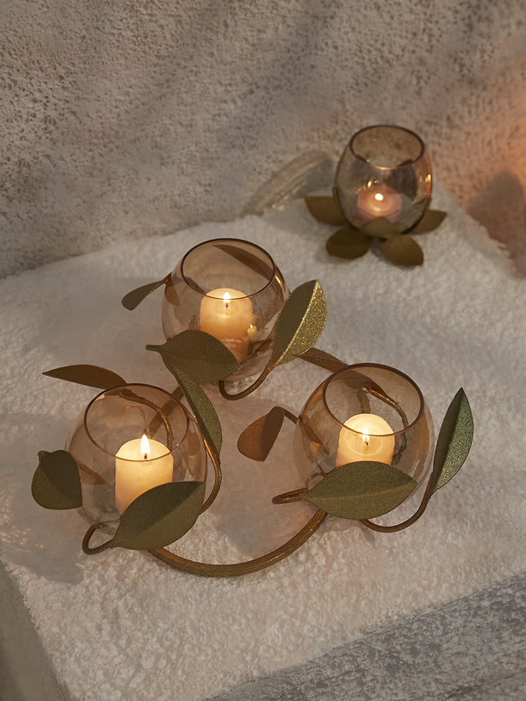 Bring a touch of botanical elegance to your candlelit evenings with this gold candle stand from Westside Home. The oval shape of the stand provides versatility in placement. Each leaf is intricately detailed. capturing the essence of nature’s elegance.