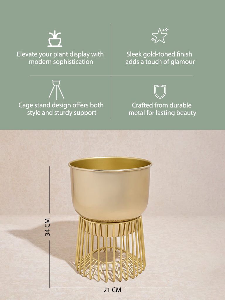 Elevate your plant game with this gold planter from Westside Home. The planter features a sleek gold-toned finish that catches the light. adding an element of glamour to your greenery. Set within a cage-like stand. this design brings a modern edge to your plant display while providing a sturdy base. Perfect for showcasing vibrant indoor plants. this piece adds a touch of chic sophistication and contemporary flair to any room. making your greenery truly stand out.