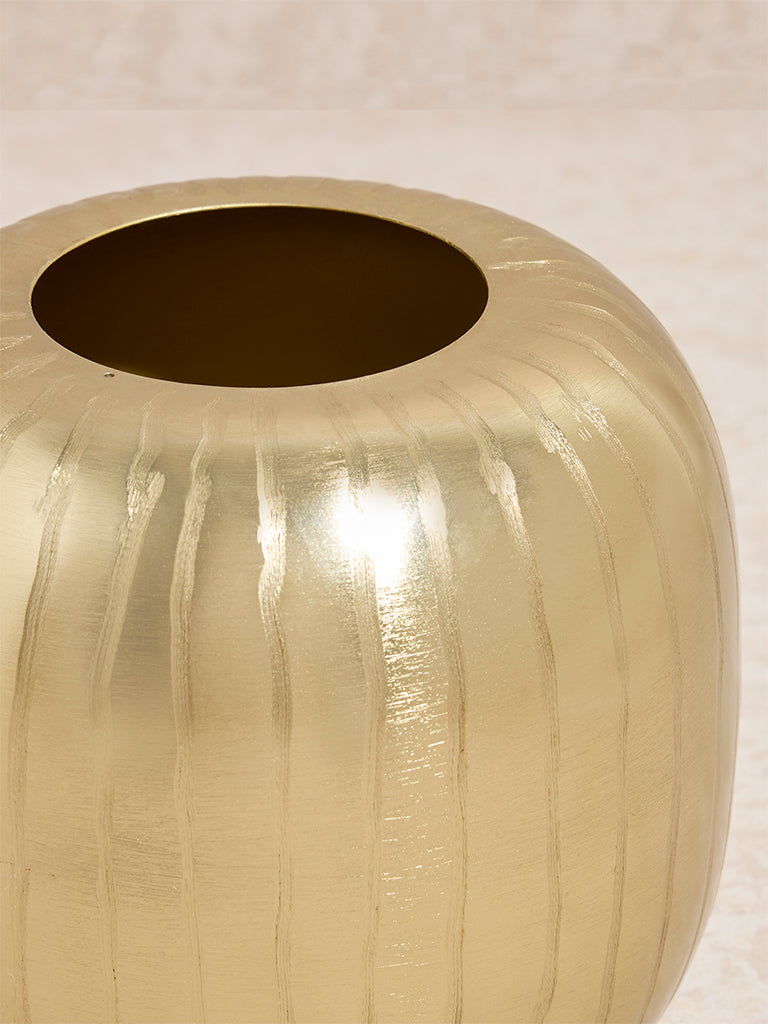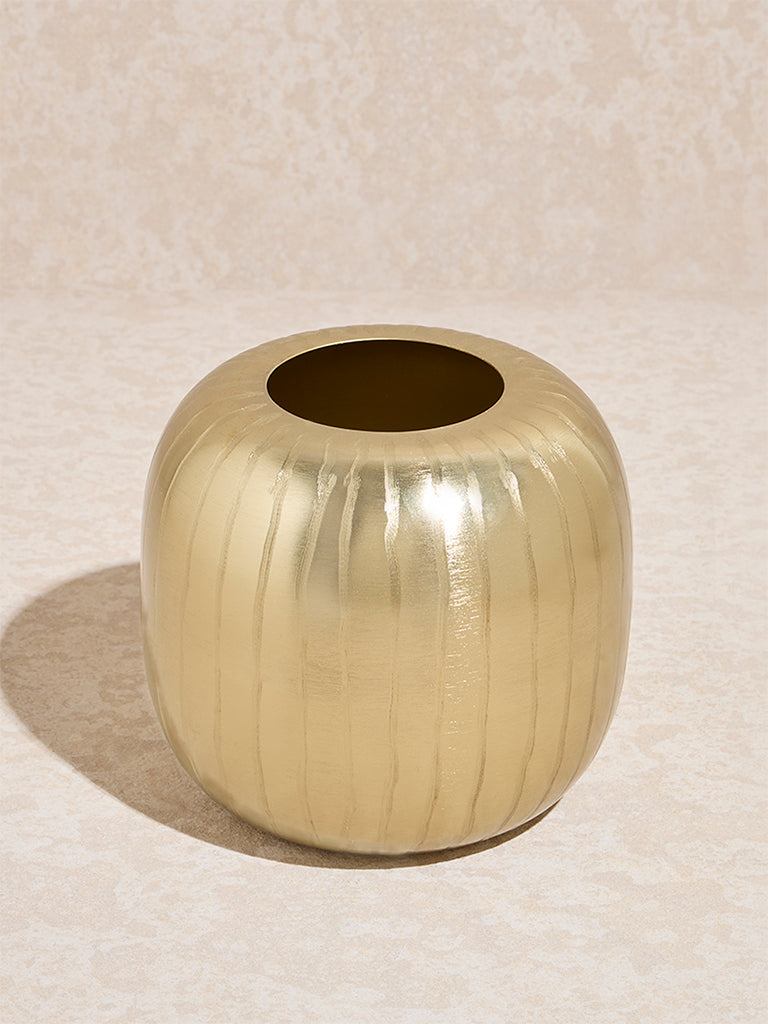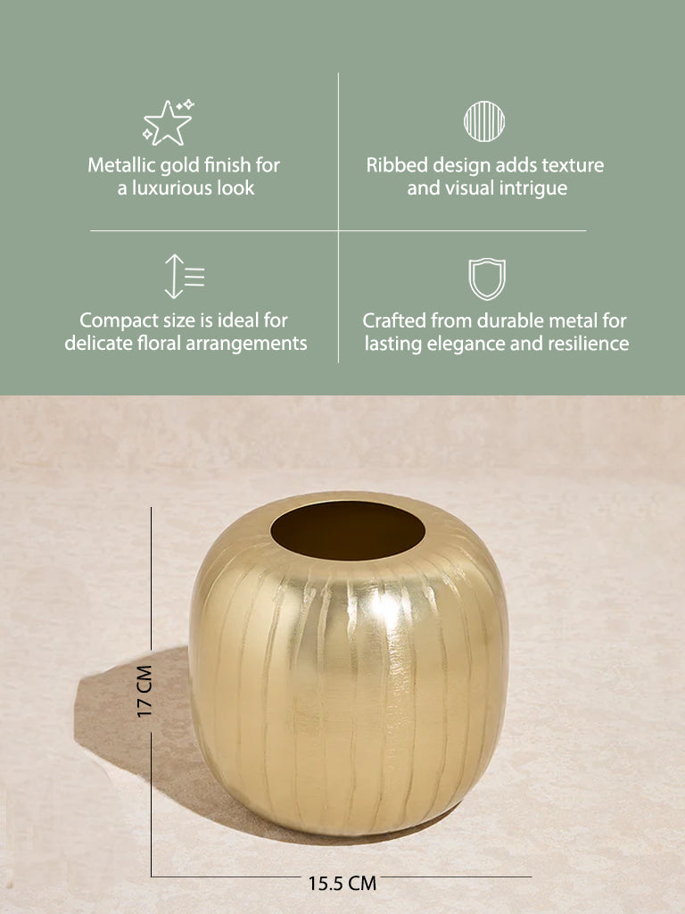 This gold vase from Westside Home boasts a metallic build with a stunning gold tone. Its ribbed design and texture add a sophisticated touch. creating a striking visual appeal. The small size. hollow interior. and open top make it perfect for showcasing delicate flowers or simply as a decorative accent. Ideal for adding a touch of elegance to any space. this vase combines modern style with functional beauty. making it a charming addition to your home decor.