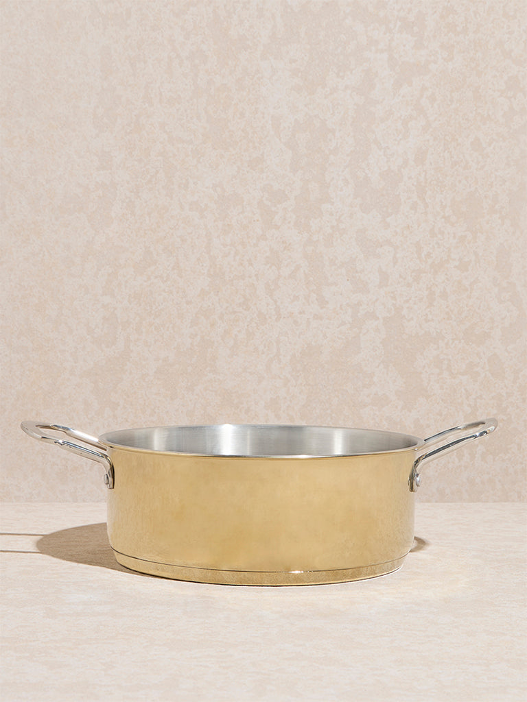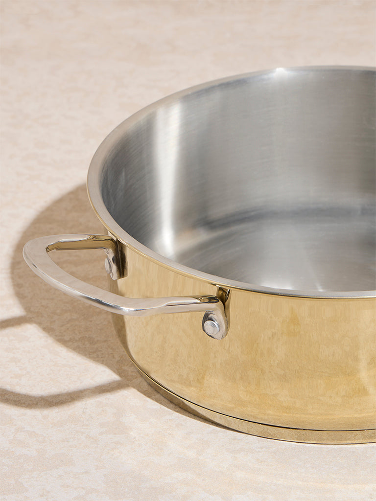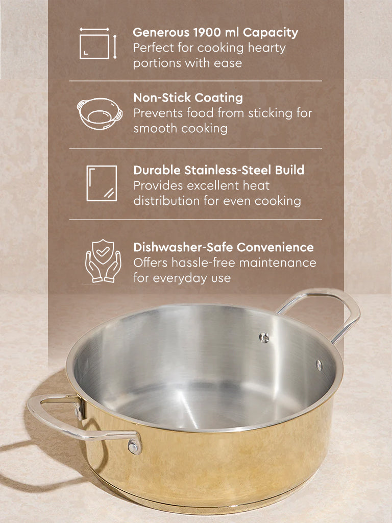 Enhance your cooking experience with this saute pan from Westside Home. With its spacious surface and stylish gold finish. this pan is designed for sauteing. stir-frying. and browning your favourite dishes. The non-stick coating ensures effortless food release and easy cleanup. while the durable construction guarantees long-lasting use. Whether preparing vegetables. meats. or sauces. this saute pan delivers excellent heat distribution for consistent cooking results. adding a touch of luxury to your kitchen while maintaining versatility.