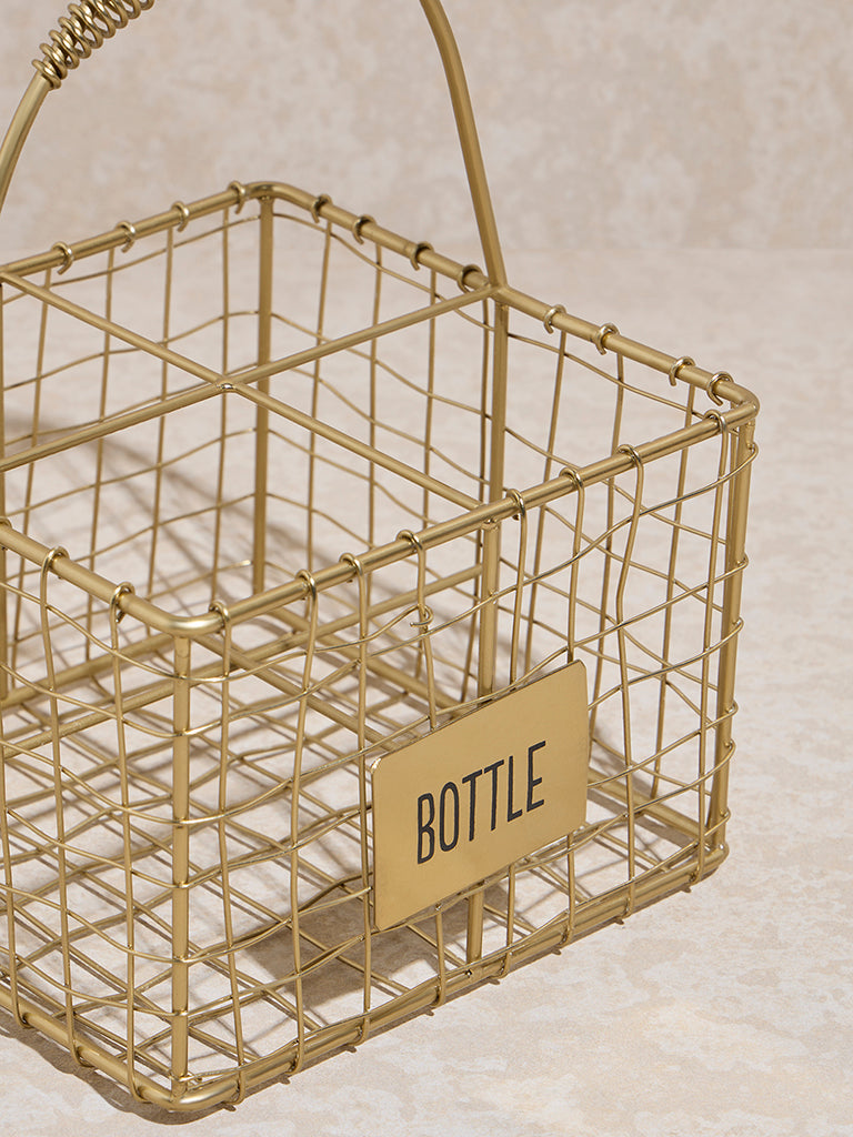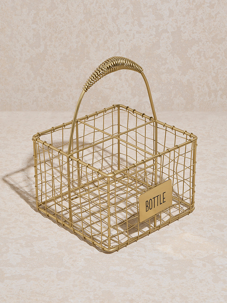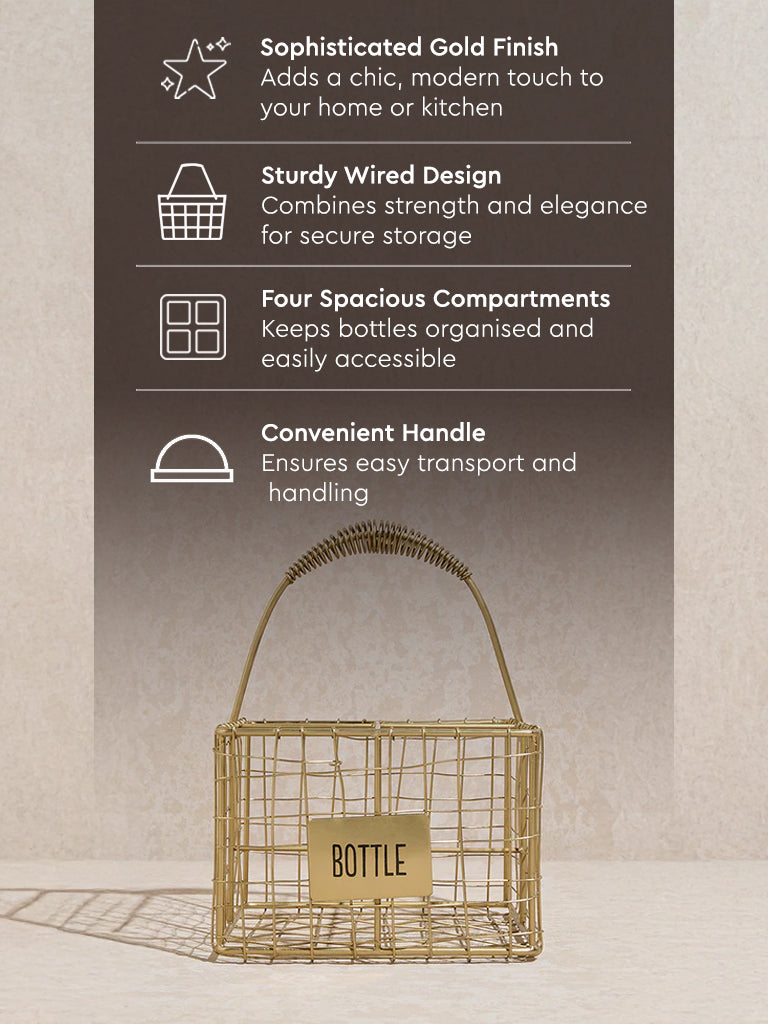 Organize and display your bottles in style with Westside Home’s gold bottle holder. Made from high-quality materials. it features a durable wired structure that provides both strength and elegance. Designed with four compartments. the holder offers ample space to store your bottles securely. The attached handle ensures easy and secure handling. making it convenient to move and transport. With its sophisticated gold finish. this bottle holder adds a chic. modern touch to any home or kitchen.