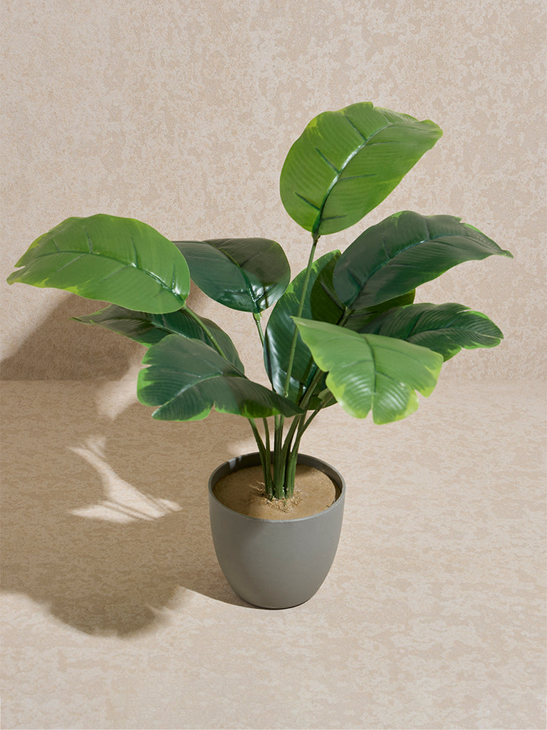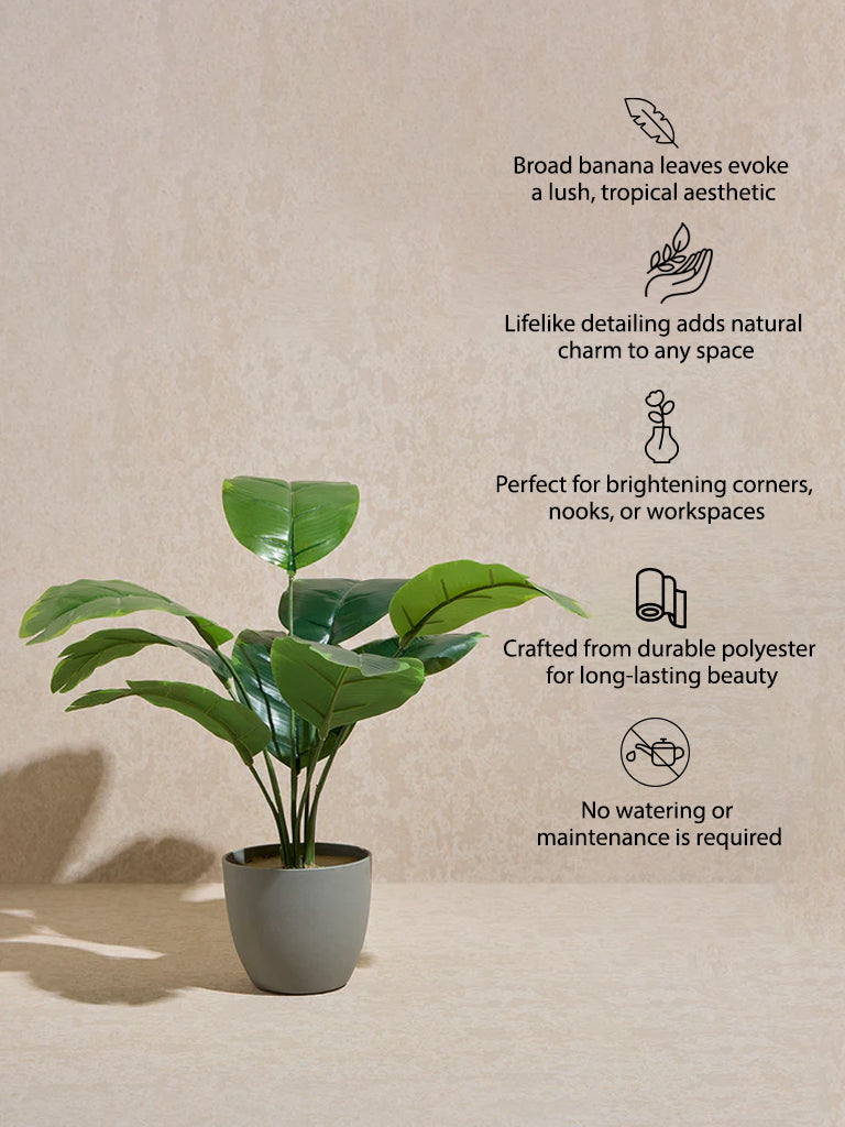 Westside Home introduces this green artificial banana leaf plant. a vibrant statement piece designed to infuse your space with lush greenery. Its broad. sweeping leaves capture the essence of tropical beauty. showcasing natural textures and rich green tones for a strikingly realistic look. Set in a simple black pot. this botanical accent adds depth and dimension. effortlessly elevating both contemporary and classic interiors. Whether placed in a sunlit corner. next to a reading nook. or as a refreshing touch to your workspace. this plant brings a fresh and inviting ambiance without the need for upkeep.