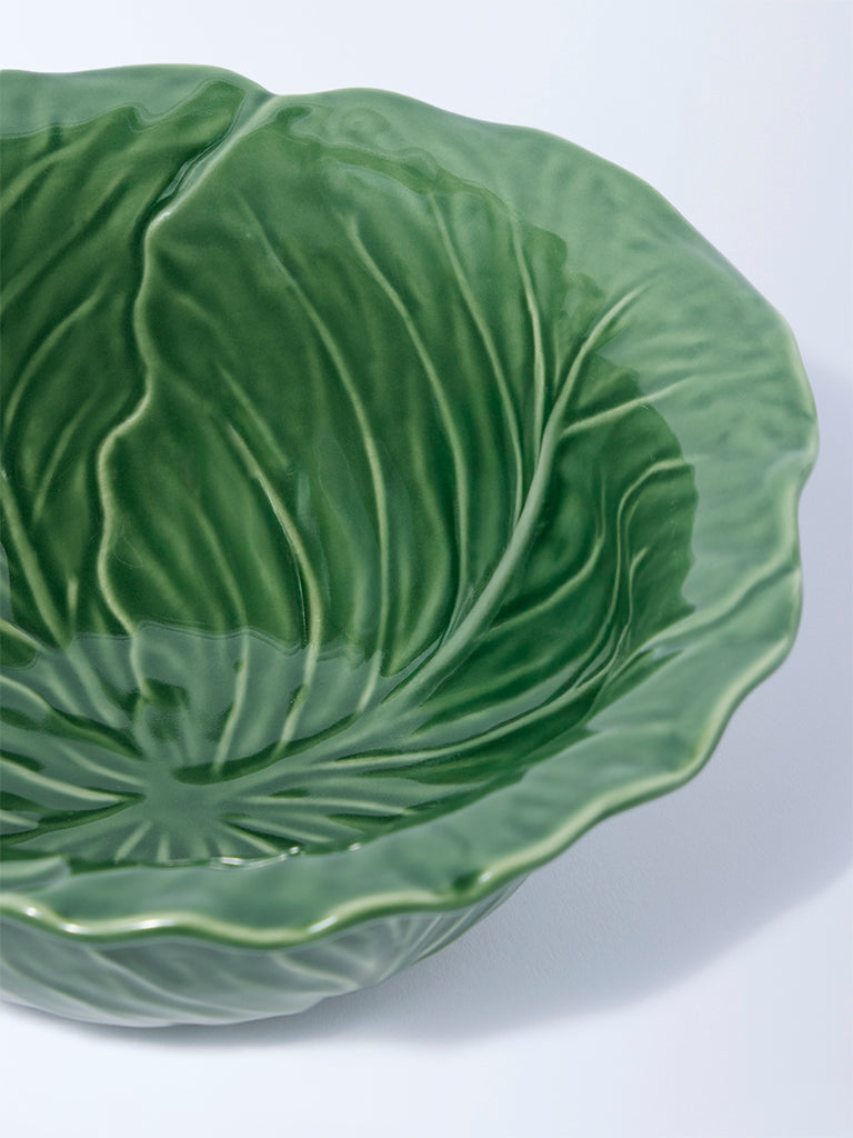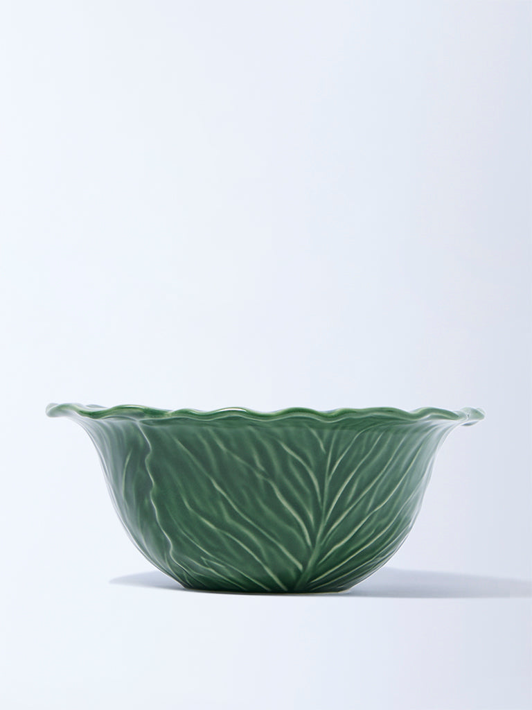 Shaped to charm and crafted to serve. this green bowl from Westside Home features a striking cabbage leaf design that blends whimsy with elegance. The glazed finish enhances its rich green tone. while the sculpted detailing adds texture and depth. Perfect for serving salads. fruits. or simply styling a table. it makes a statement whether used alone or as part of a nature-inspired spread. A bold. botanical addition to both everyday meals and special gatherings.