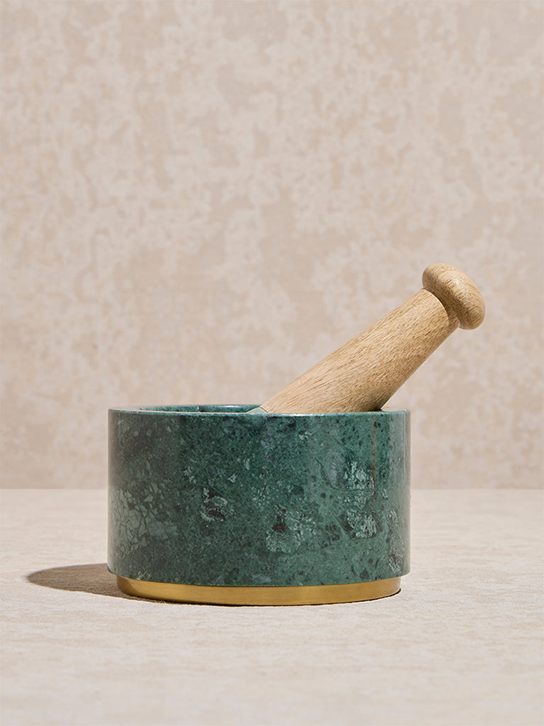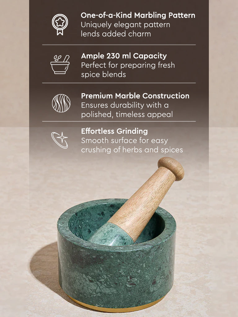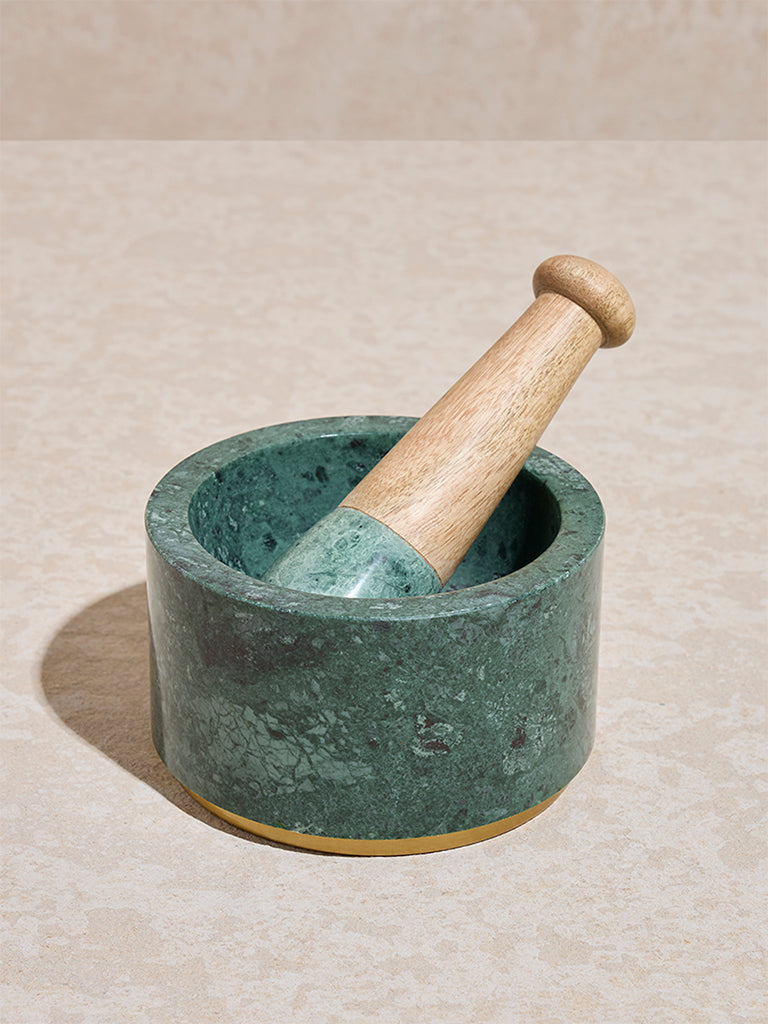 Add a touch of luxury to your kitchen with this mortar and pestle from Westside Home. Crafted from rich. polished green marble. this mortar and pestle set is not only a functional tool for grinding spices and herbs but also a striking decor piece. The unique marbling pattern ensures that each piece is one-of-a-kind. making it a standout addition to your kitchen countertop. With its robust. smooth surface and timeless aesthetic. this set brings both elegance and practicality. helping you create flavorful dishes with ease.