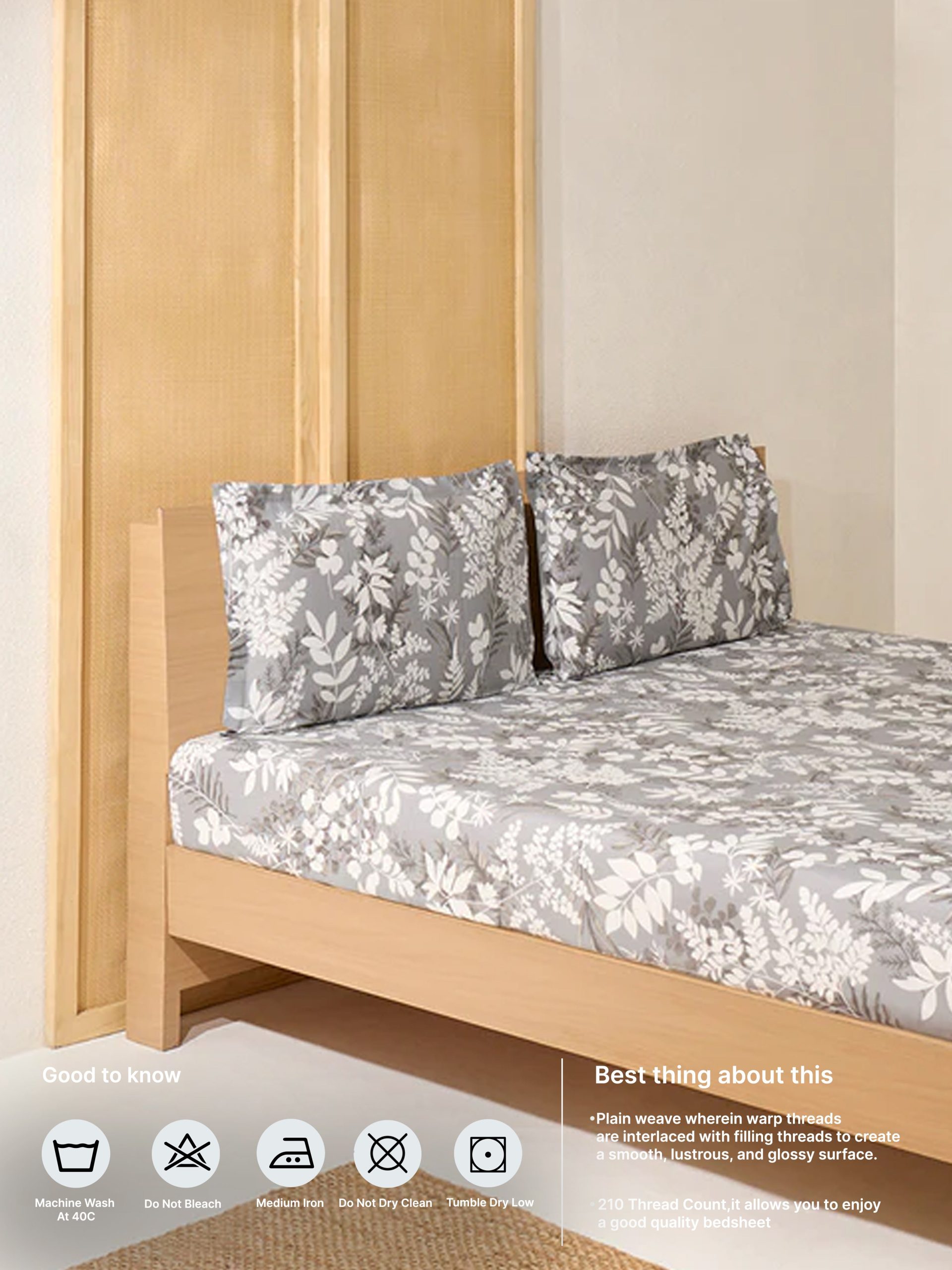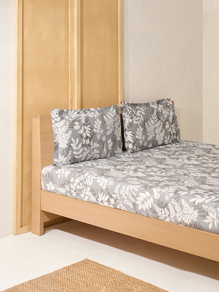 Infuse your bedroom with botanical elegance through this grey king bed flat sheet and pillowcase set from Westside Home. Crafted for a soothing sleep experience. the soft fabric showcases delicate leaf prints that bring a sense of calm and freshness to your space. Complete with a matching pillowcase duo. the double bed sheet offers a cohesive look that’s effortlessly stylish. Whether layered with bold throws or paired with neutral bedding. this set sets the stage for a restful and refined sleep environment.
