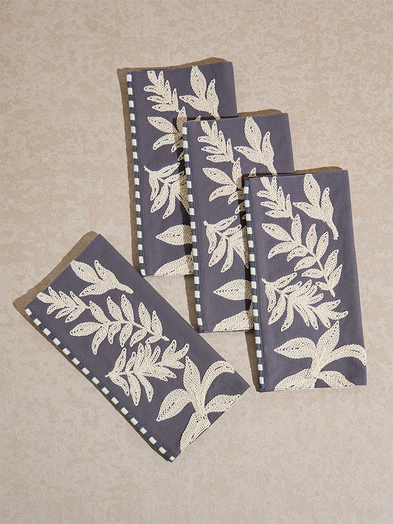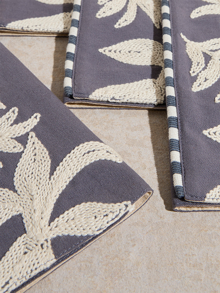 Westside Home presents this set of four grey placemats. beautifully adorned with delicate white leaf embroidery. Crafted from high-quality fabric. they offer durability while adding a sophisticated charm to your dining space. Perfect for everyday use or special occasions. these placemats protect your table from spills and scratches while elevating its aesthetic appeal.