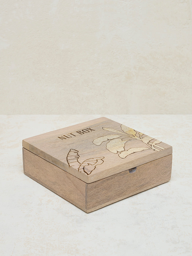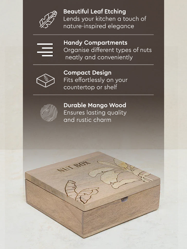 Organize your favorite nuts in this nut box from Westside Home. With a beautifully etched leaf pattern. this box not only serves as a practical storage solution but also adds a touch of nature to your kitchen. The light brown wood finish creates a warm. inviting aesthetic. while the box keeps your nuts fresh and neatly stored. Perfect for everyday use or as a thoughtful gift. this nut box brings a blend of rustic charm and functionality to your countertop.