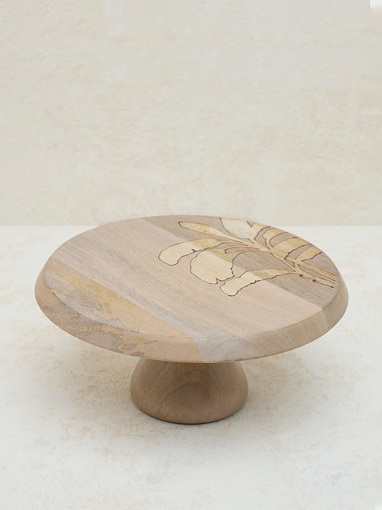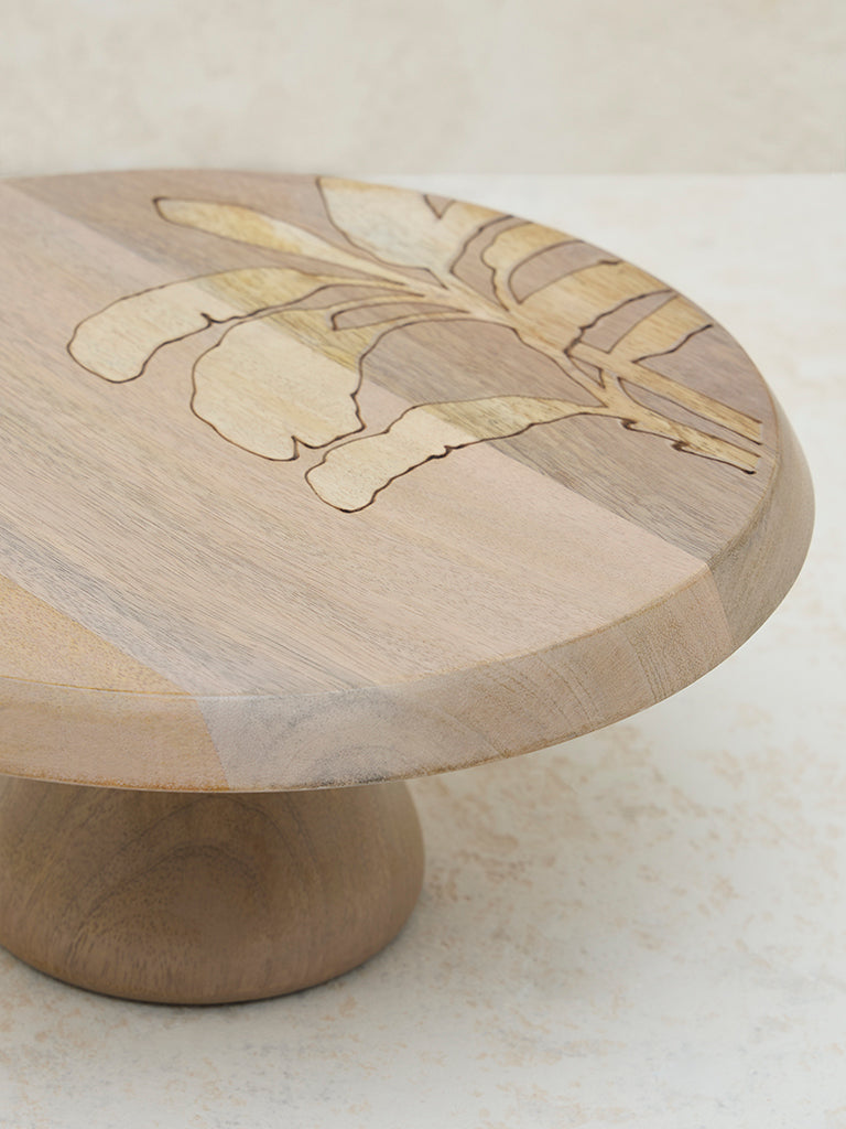 Showcase your homemade cakes and desserts with this cake stand from Westside Home. The elegant leaf etching on the surface adds a natural and refined touch to your table setting. while the light brown wooden base brings warmth and charm to any occasion. Perfect for serving cakes. pastries. or fruits. this cake stand is ideal for both casual and festive settings. Its sturdy design ensures stability. making it a functional and aesthetic addition to your dining experience.