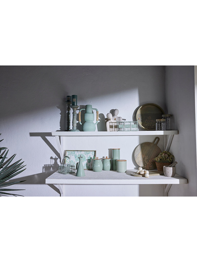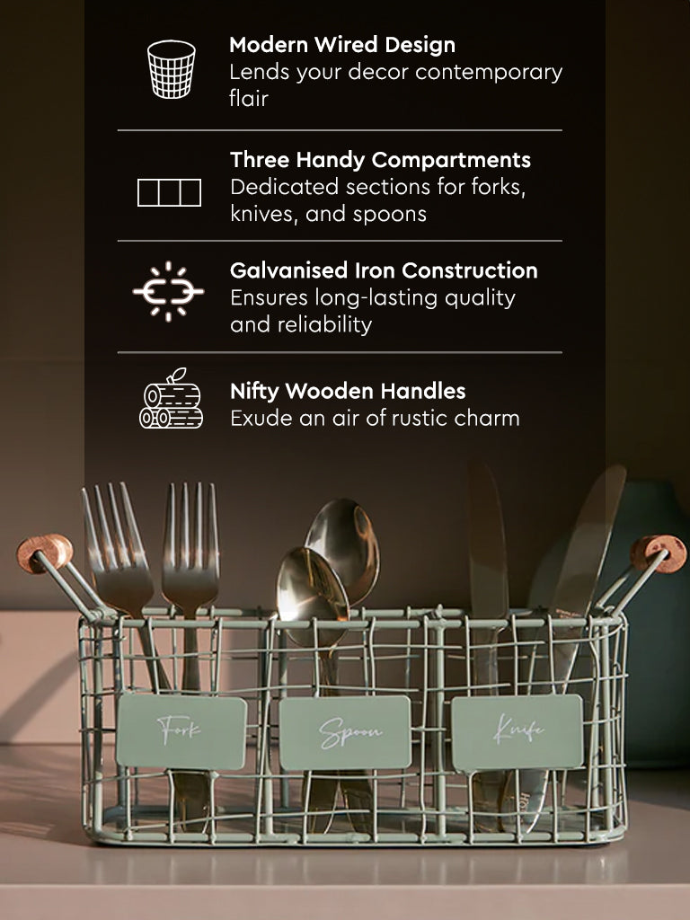 Organising your cutlery effortlessly. this mint caddy from Westside Home is a practical investment. Storing all your spoons. forks and knives. it features a wired frame with charming wooden handles that bring modern sophistication to your kitchen or dining table.