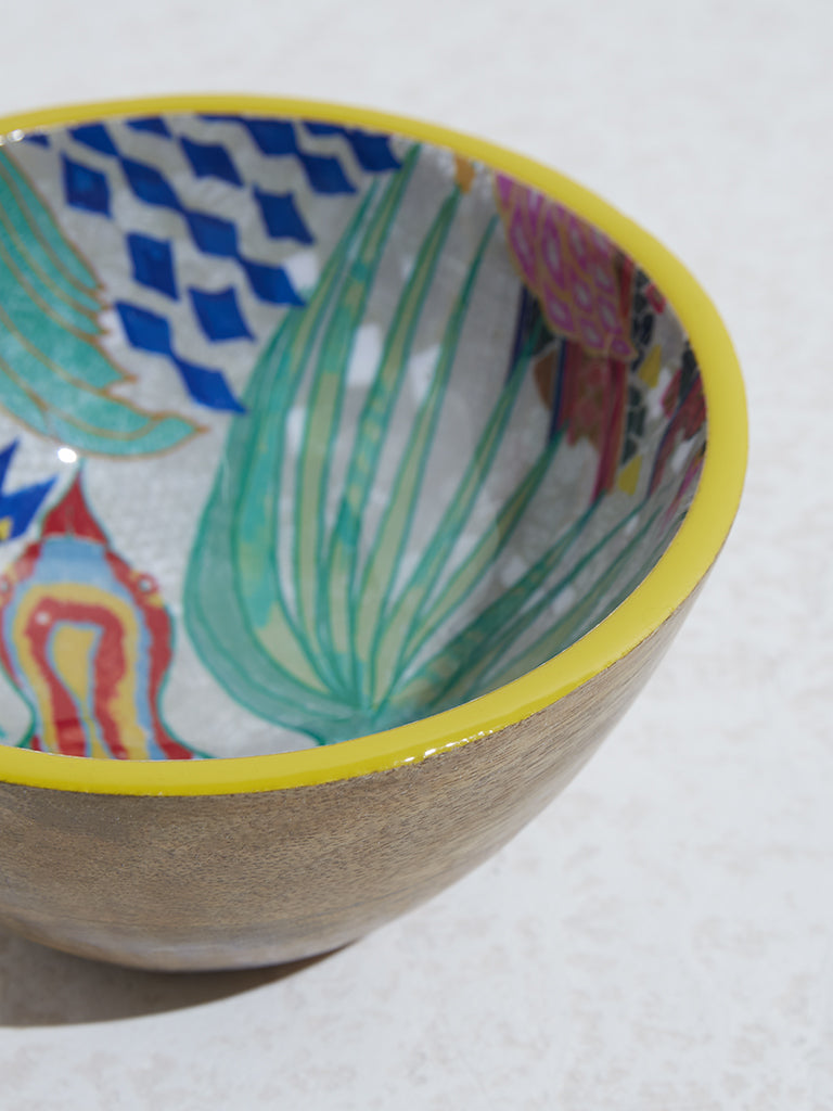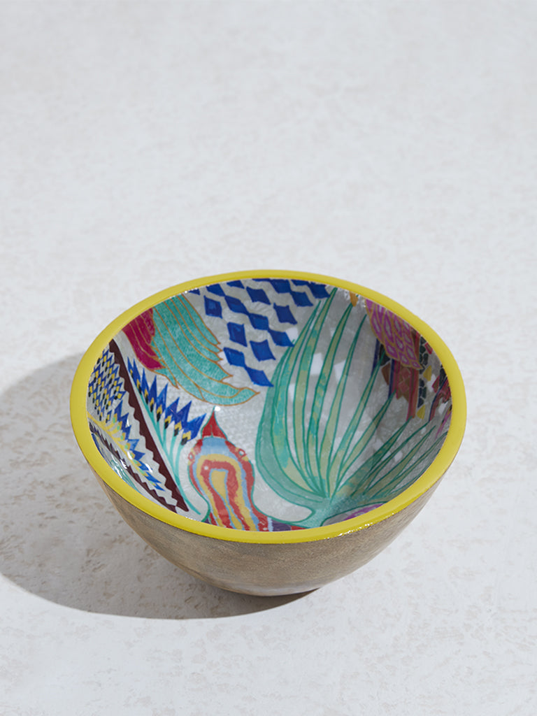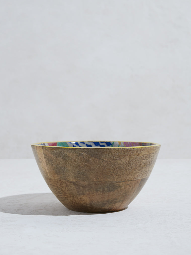 Create a standout addition to your kitchen or dining decor with this bowl from Westside Home. Each bowl is meticulously crafted from high-quality wood. adorned with a captivating multicolour print that enhances its natural grain and texture. Perfect for serving appetizers. nuts. or small salads. this bowl brings a vibrant accent to any culinary presentation. Its compact size and smooth finish ensure durability and a pleasing tactile experience.