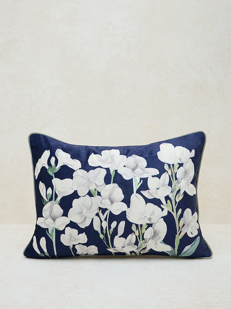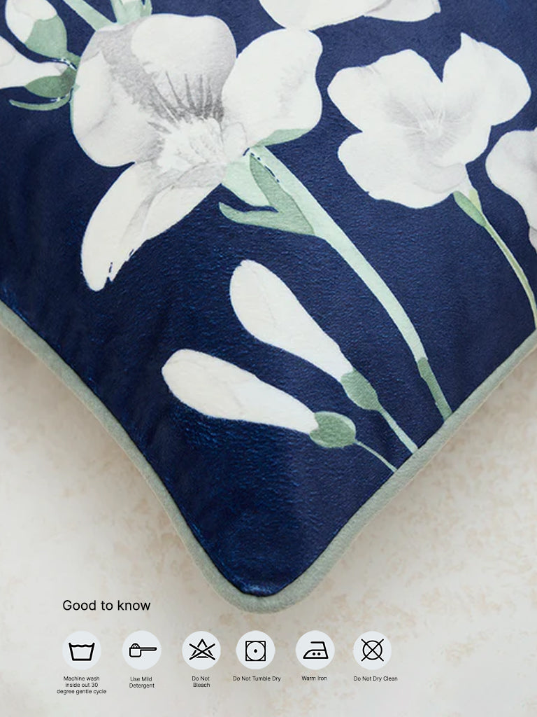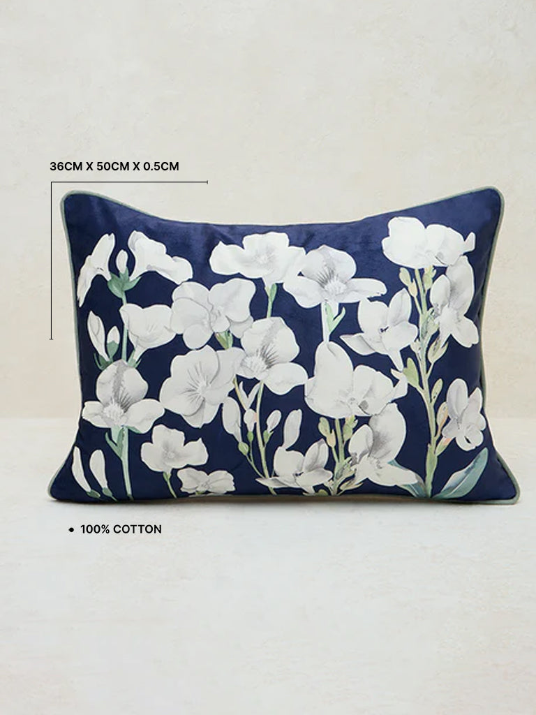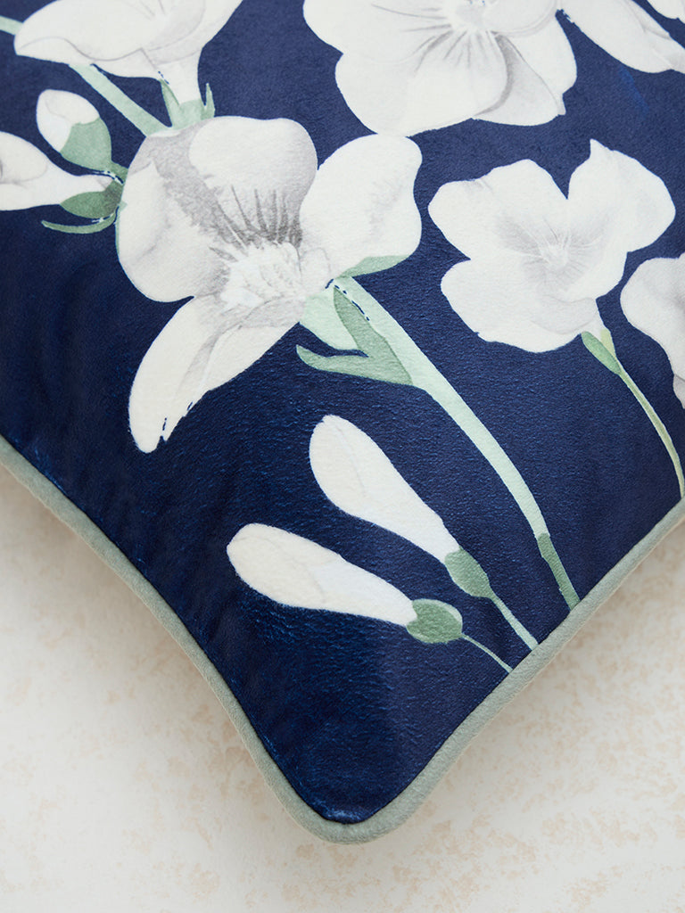 Add a touch of nature-inspired elegance with this cushion cover from Westside Home. The deep navy backdrop beautifully highlights the delicate floral motifs. creating a striking yet harmonious design. Ideal for adding depth and contrast to lighter interiors or complementing rich. bold decor styles. this cushion cover offers a refined balance of charm and sophistication.