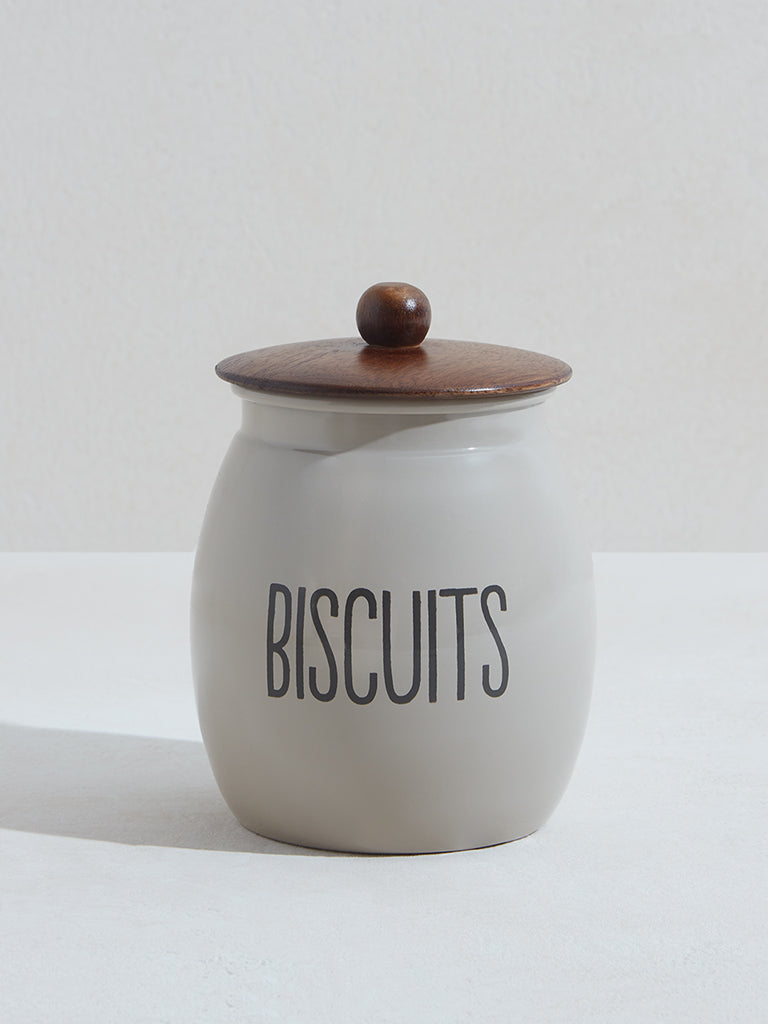 Infuse your kitchen with timeless elegance by investing in this off white biscuit canister from Westside Home. Featuring a wooden lid. it blends modern charm with rustic allure. It preserves biscuits while adding a sophisticated touch to your decor.