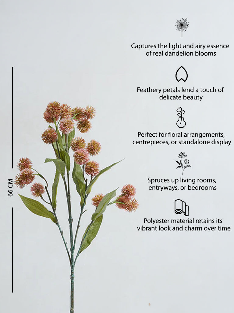 This pink dandelion artificial flower from Westside Home brings a touch of whimsical charm and delicate beauty to your space. Designed to mimic the light and airy look of dandelion blooms. this artificial flower showcases fluffy. feathery petals that capture the essence of nature’s elegance. Its quality build retains the look and colour of this decor piece. Perfect for use in floral arrangements. centerpieces. or as a standalone decorative piece. It enhances various settings. including living rooms. bedrooms. and entryways. adding a playful yet sophisticated charm.