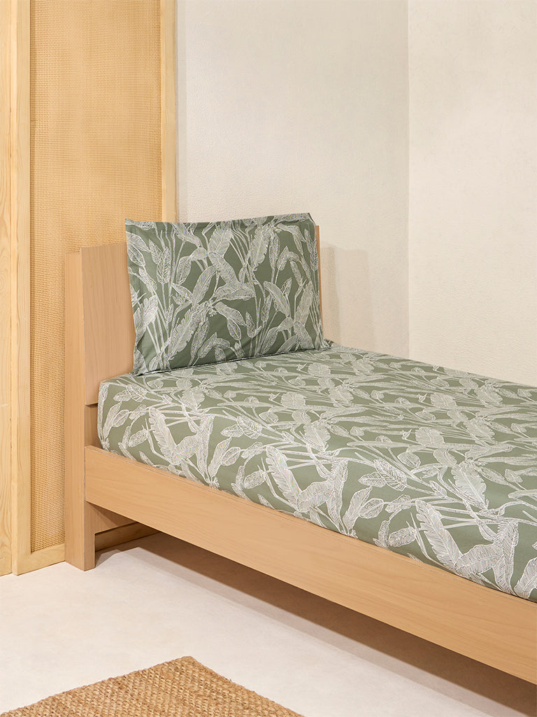 Westside Home Sage Leaf Pattern Single Bed Fitted Sheet and Pillowcase Set