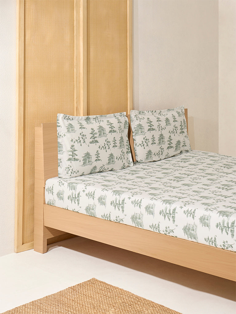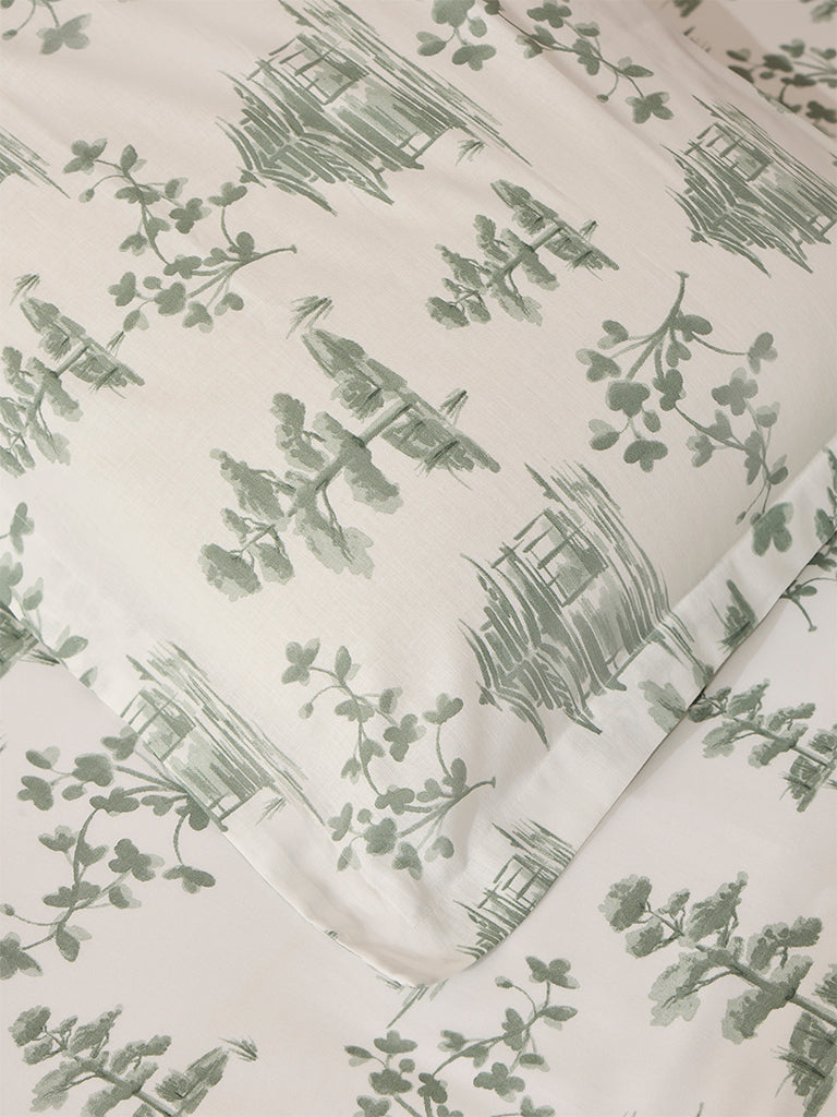 Step into a storybook setting each night with this sage toile bed flat sheet and pillowcase set from Westside Home. Featuring pastoral scenes rendered in vintage-style sketch work. this king-size sheet adds quiet sophistication to your bedroom. The soft sage green base calms the senses. while the matching pillowcases complete the narrative. Perfect for creating a layered. heritage-inspired beds cape that’s both timeless and full of charm.