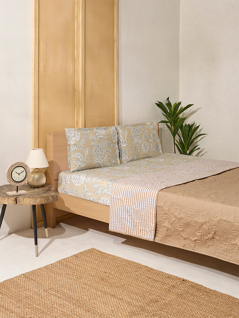 Redefine comfort with this taupe reversible Double comforter from Westside Home. thoughtfully designed to bring subtle sophistication to your bedroom. The dual-sided profile lets you switch between clean. contemporary stripes for a streamlined look and quilted detailing for added texture and warmth. Made with a lightweight yet insulating build. it offers year-round coziness without the bulk. Perfect for blending into neutral interiors or layering with bold accents. this comforter becomes a versatile centrepiece that marries style with restful ease.