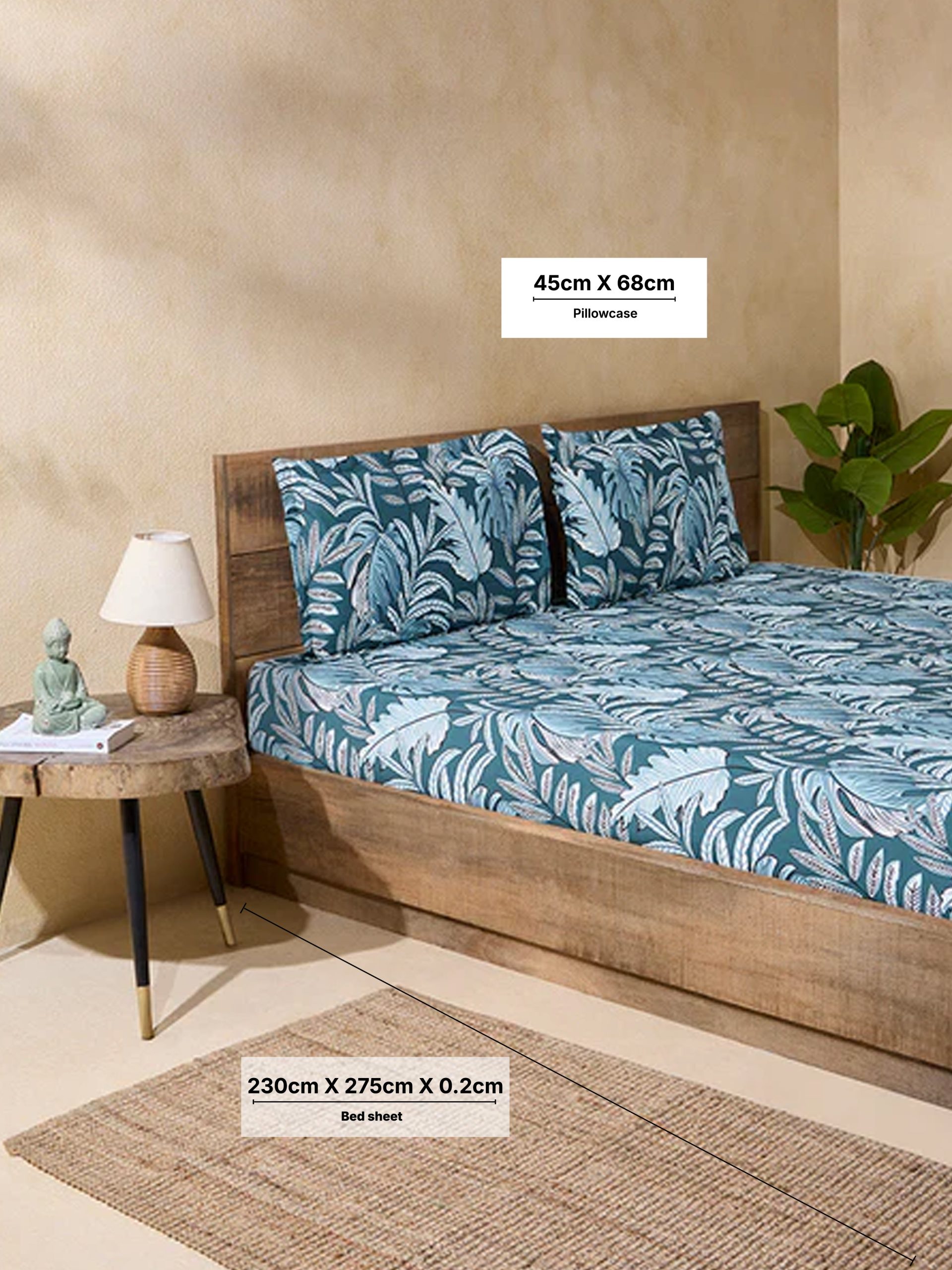 Create a serene haven with this Queen bed flat sheet and pillowcase set from Westside Home. Featuring a graceful leaf-inspired pattern in tranquil teal hues. this set adds a refreshing touch of nature to your bedroom decor. The flat sheet drapes beautifully over your Queen bed. while the matching pillow covers enhance the cohesive and elegant look. Crafted from soft. durable fabric. it provides ultimate comfort and style for everyday use. A perfect blend of functionality and charm. this set is ideal for transforming your room into a calming retreat.