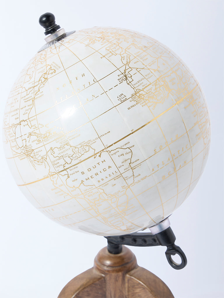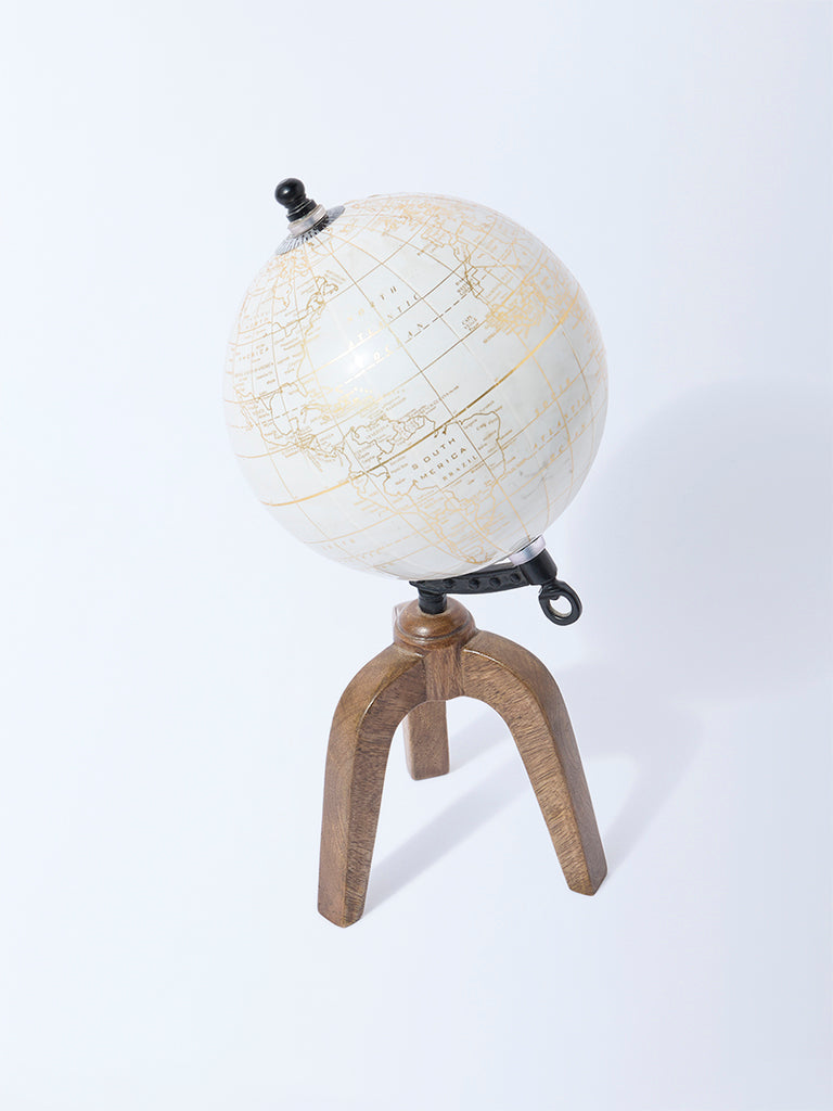 Designed as a modern statement piece. this white globe on a gold tripod stand from Westside Home fuses simplicity with elegance. The globe’s smooth finish is balanced by the metallic base. creating a refined contrast that draws attention. Ideal for desks. consoles. or side tables. it lends a contemporary edge to living spaces while doubling as a conversation starter.