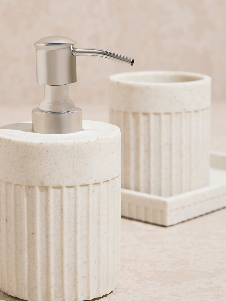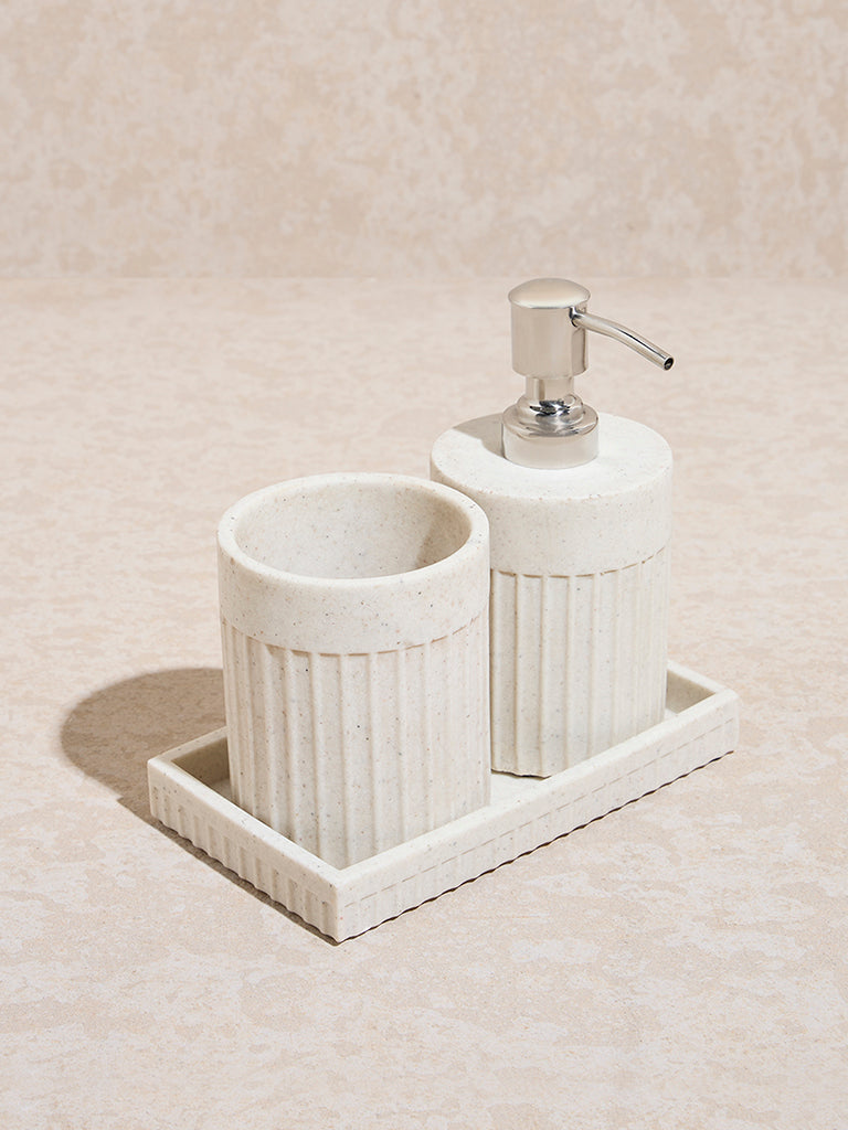 Redefine your bathroom aesthetics with this bathroom accessory set from Westside Home. This elegant set includes a sleek dispenser and a coordinating holder. both adorned with ribbed textures for a refined. modern look. The pristine white finish adds a touch of sophistication. while the functional design ensures practicality. Perfect for organizing your essentials. this set enhances your bathroom decor with a blend of style and utility.