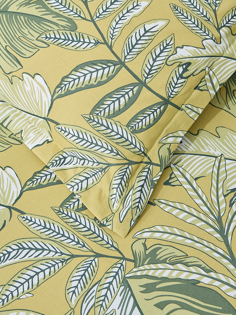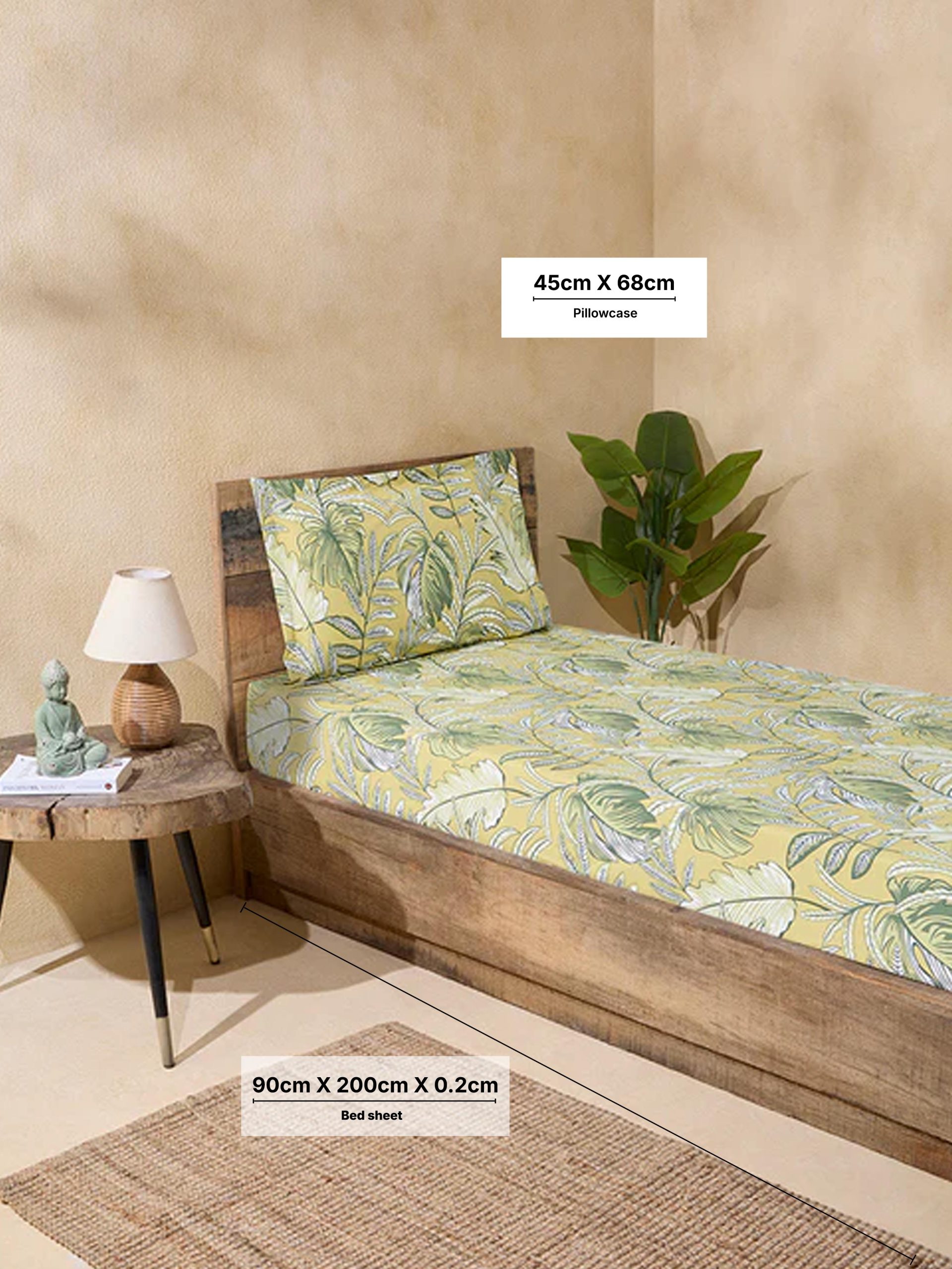 Infuse your bedroom with sunny vibes using this single bed fitted sheet and pillowcase set from Westside Home. Bursting with vibrant tropical motifs in cheerful yellow tones. this set adds an energetic and refreshing touch to your space. The fitted sheet hugs your mattress snugly. ensuring a sleek. crease-free look. while the soft. breathable fabric keeps you comfortable through the night. Perfect for brightening up your room. this set combines playful design with everyday practicality.