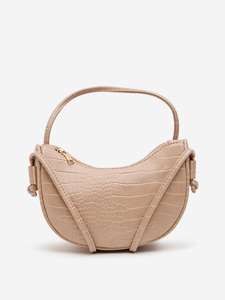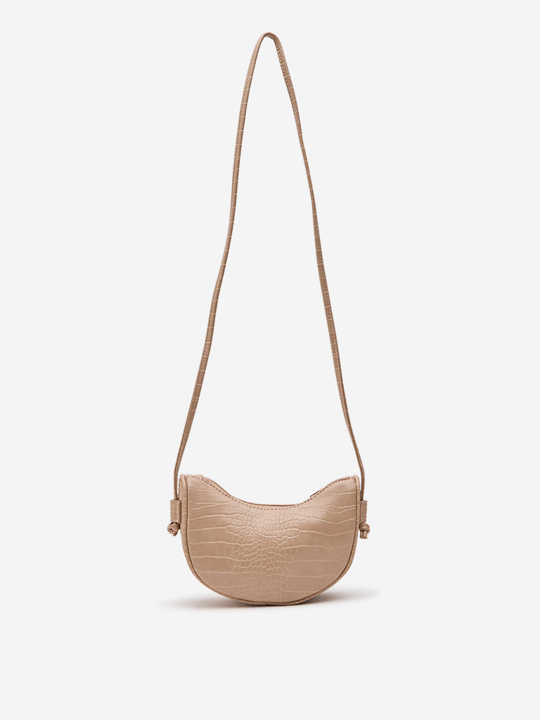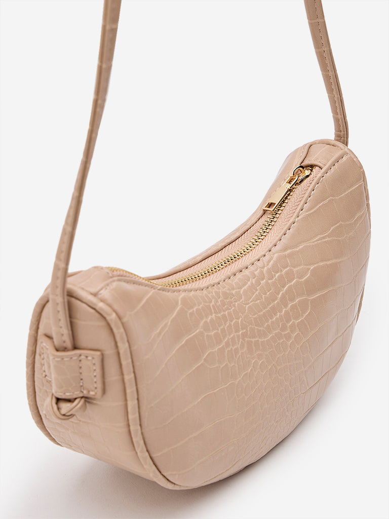 This light beige sling bag by Westside features a textured reptilian design. It is helped with a shoulder rest strap and has a zipper closure completing its modish design.