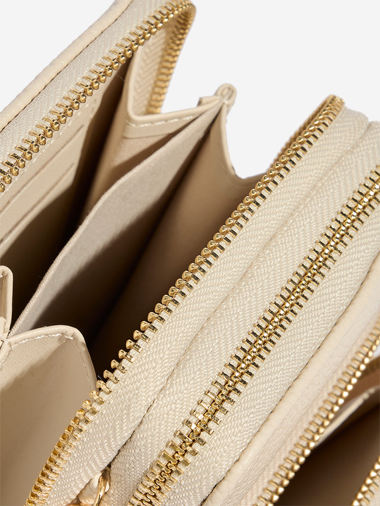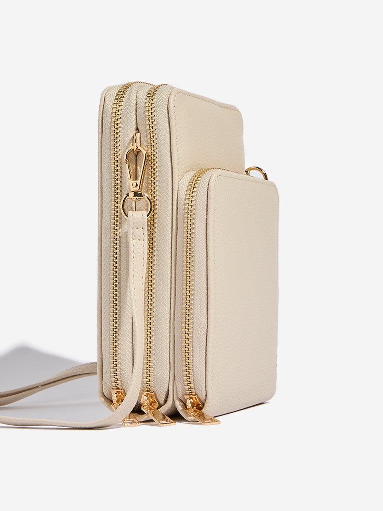 Westside Accessories brings this light beige sling bag exhibiting a textured design. It is made from a faux-leather material and features multiple zipped compartments for enhanced practicality. An adjustable sleek shoulder strap adds chic detail to its minimalistic design.
