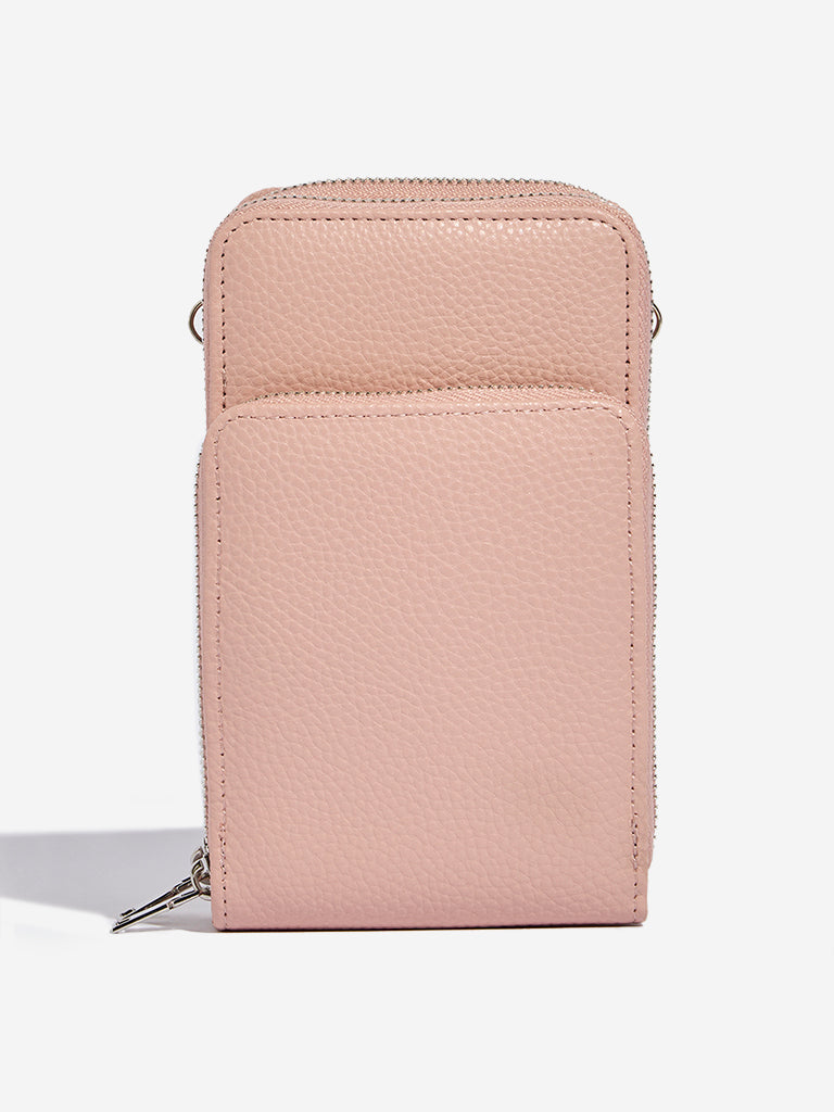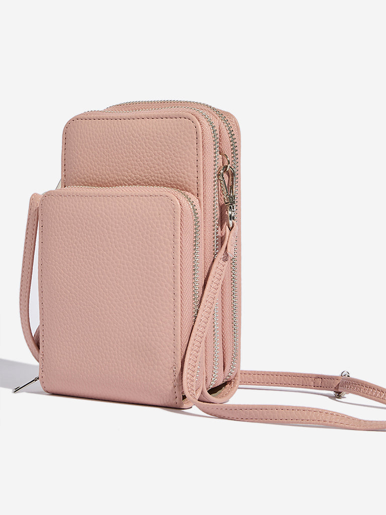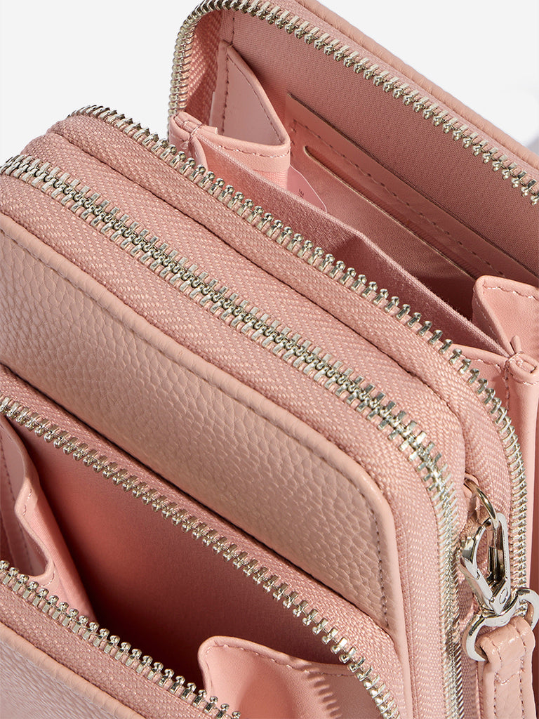 This light pink sling bag by Westside Accessories exhibits a textured design. It is made from a faux-leather material and features multiple zipped compartments for enhanced practicality. An adjustable sleek shoulder strap adds chic detail to its minimalistic design.